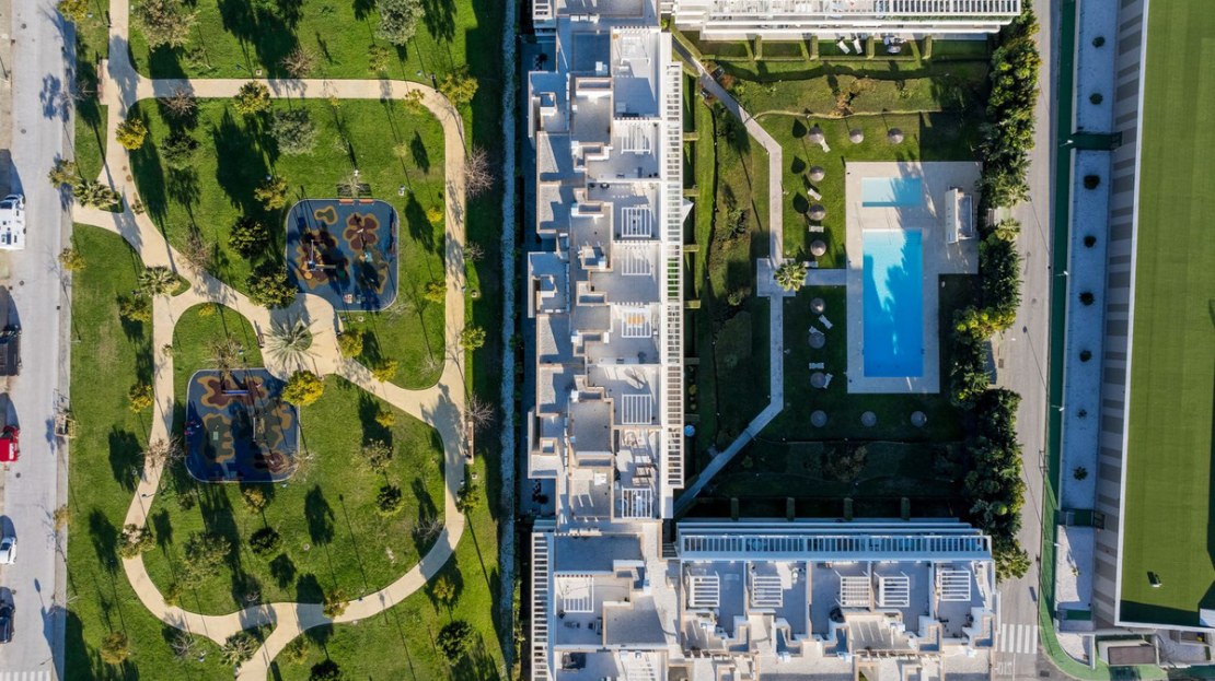 The apartment has three spacious bedrooms, the main one with an en suite bathroom and direct access to the terrace. The other bedrooms share a stylish bathroom. The open kitchen is fully equipped with high-quality appliances and merges with the airy living room, which leads out to a generous terrace overlooking the lush garden and pool area.