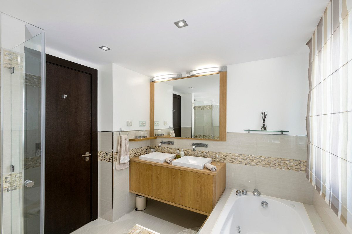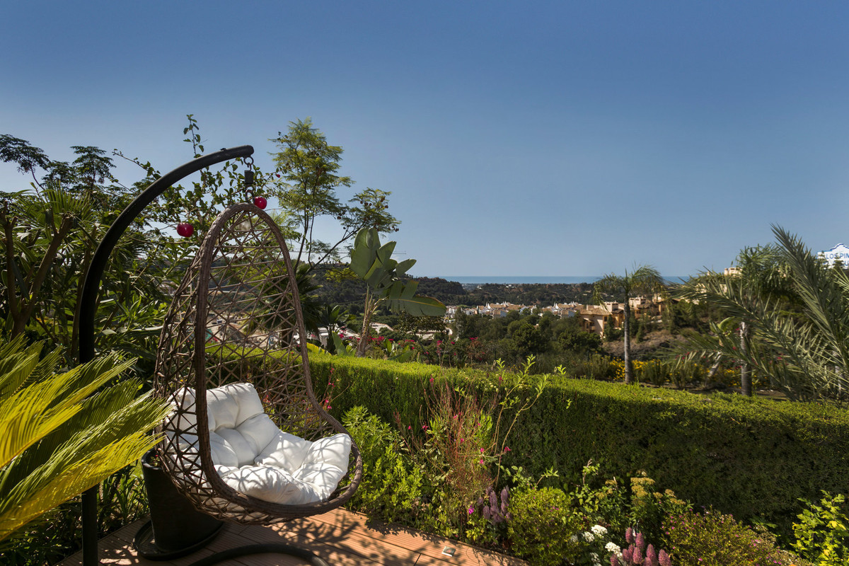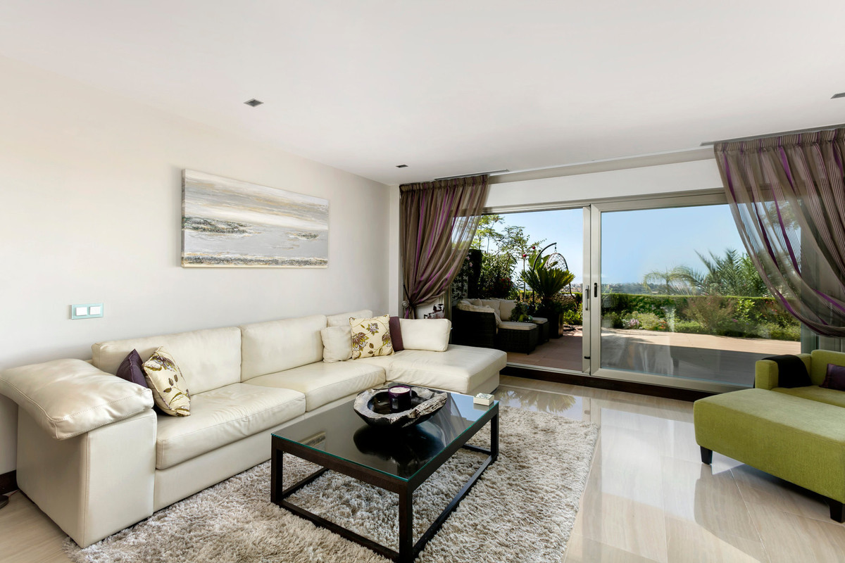 Luxurious three bedroom, south facing corner apartment in the sought after complex La Azalia, in Benahavis with stunning sea and golf views. The community has 24hr security, beautifully maintained gardens and two swimming pools; as well as being just a five minute drive to San Pedro Town and a short walk to the small village of La Heredia. The apartment has an open plan living and dining area with French doors leading out to the private sunny terrace; fully fitted kitchen with breakfast area; master suite with a walk-in wardrobe and direct access to the terrace; a guest suite; and guest bedroom and bathroom. All the bathrooms have recently been upgraded and have under floor heating. Other features include an alarm system, air-conditioning, two underground parkings and a large storage room.