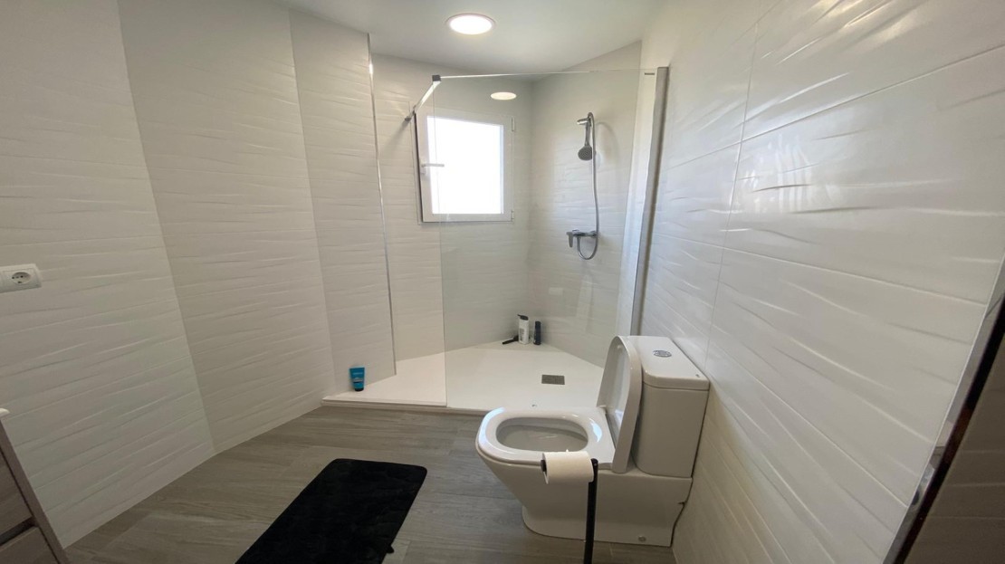 The master bedroom has a large dressing room, en-suite bathroom and a beautiful semicircular open terrace. In the same sector there is another large bedroom with a built-in designer wardrobe and an original glass bathroom that allows you to contemplate the island of Benidorm in the middle of the Mediterranean while enjoying a shower. There is also a courtesy bathroom with a shower. The third bedroom is located at the other end of the house and is designed to even be used as a multipurpose room, such as an office, or a dining room.
