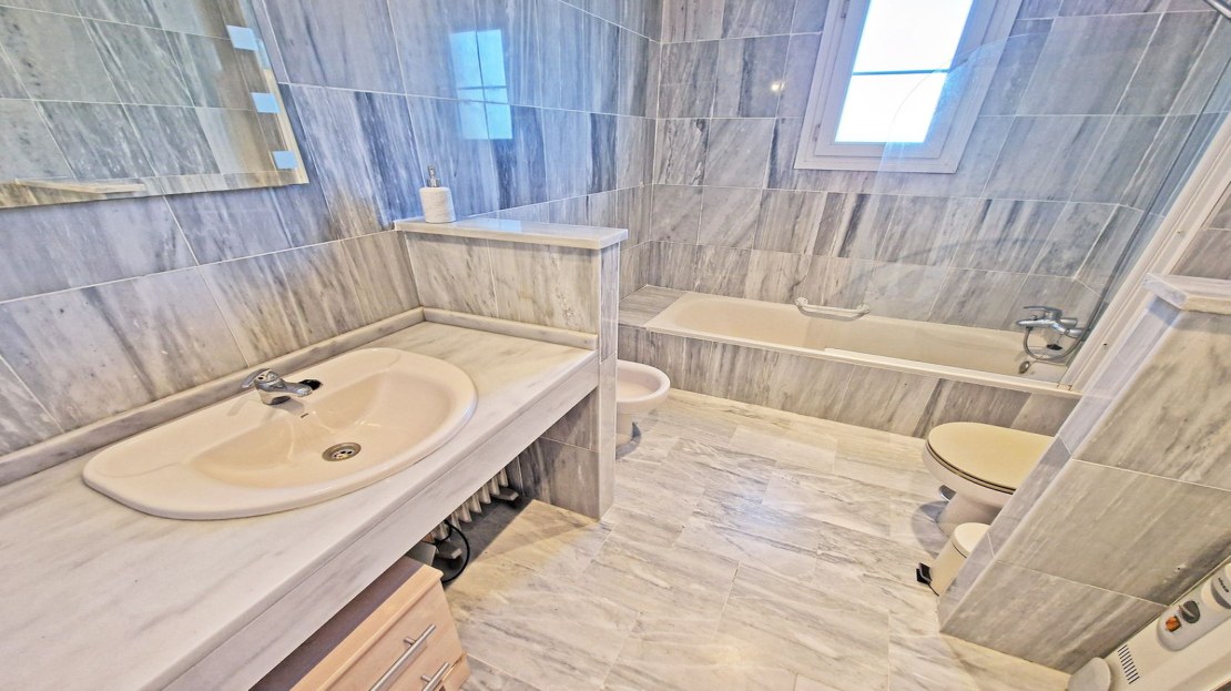 The master bedroom, with a large fitted wardrobe, enjoys direct access to the terrace and includes an ensuite bathroom with a bathtub. The two additional bedrooms also come with built-in wardrobes, and a second guest-accessible bathroom, also with a bathtub, ensures convenience for visitors.