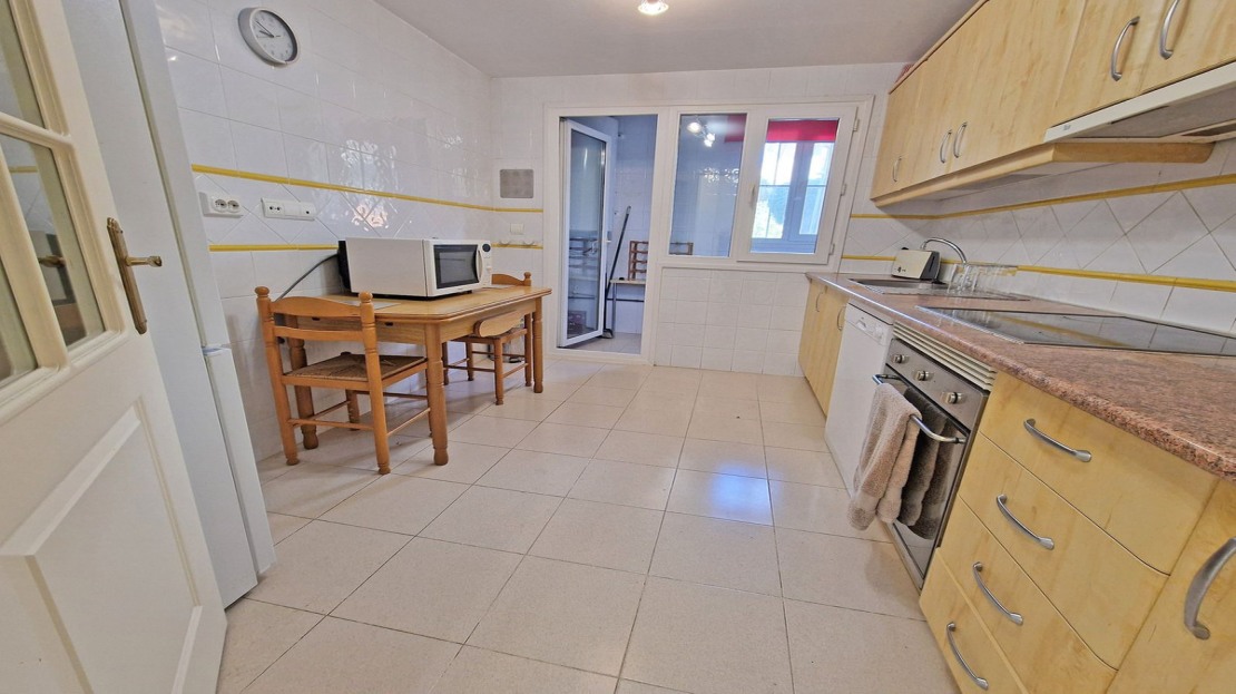 Spacious and filled with natural light, the apartment features a large southeast-facing covered terrace with breathtaking sea views. A welcoming entrance leads to a fully equipped kitchen with an adjacent laundry room, while the large living and dining area provides a comfortable and inviting space to unwind.