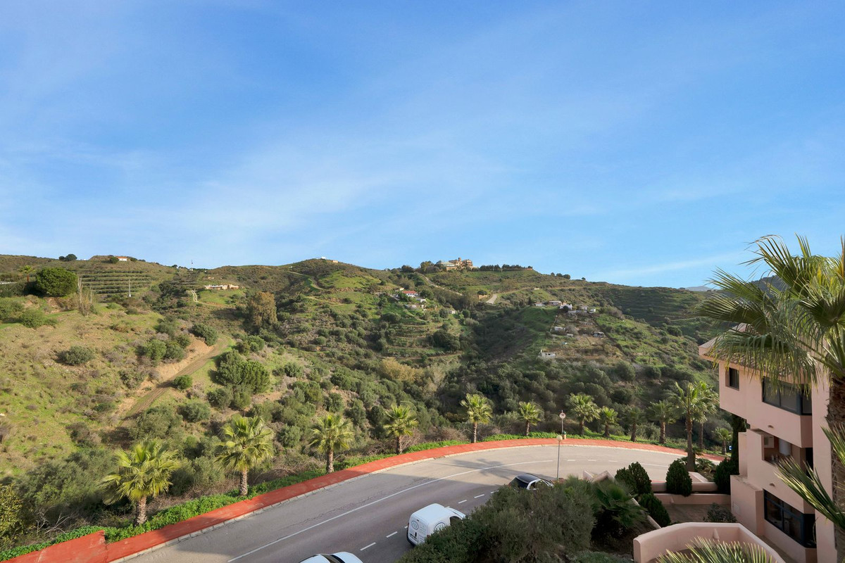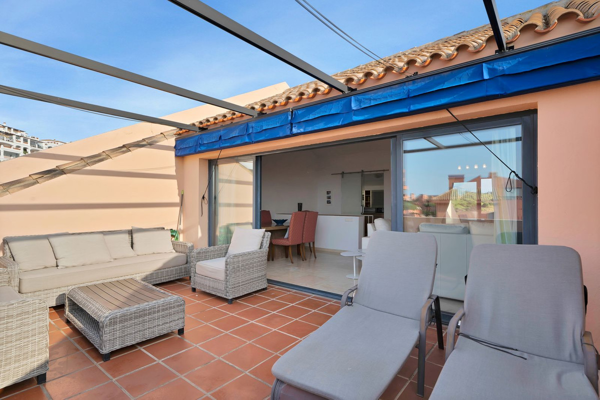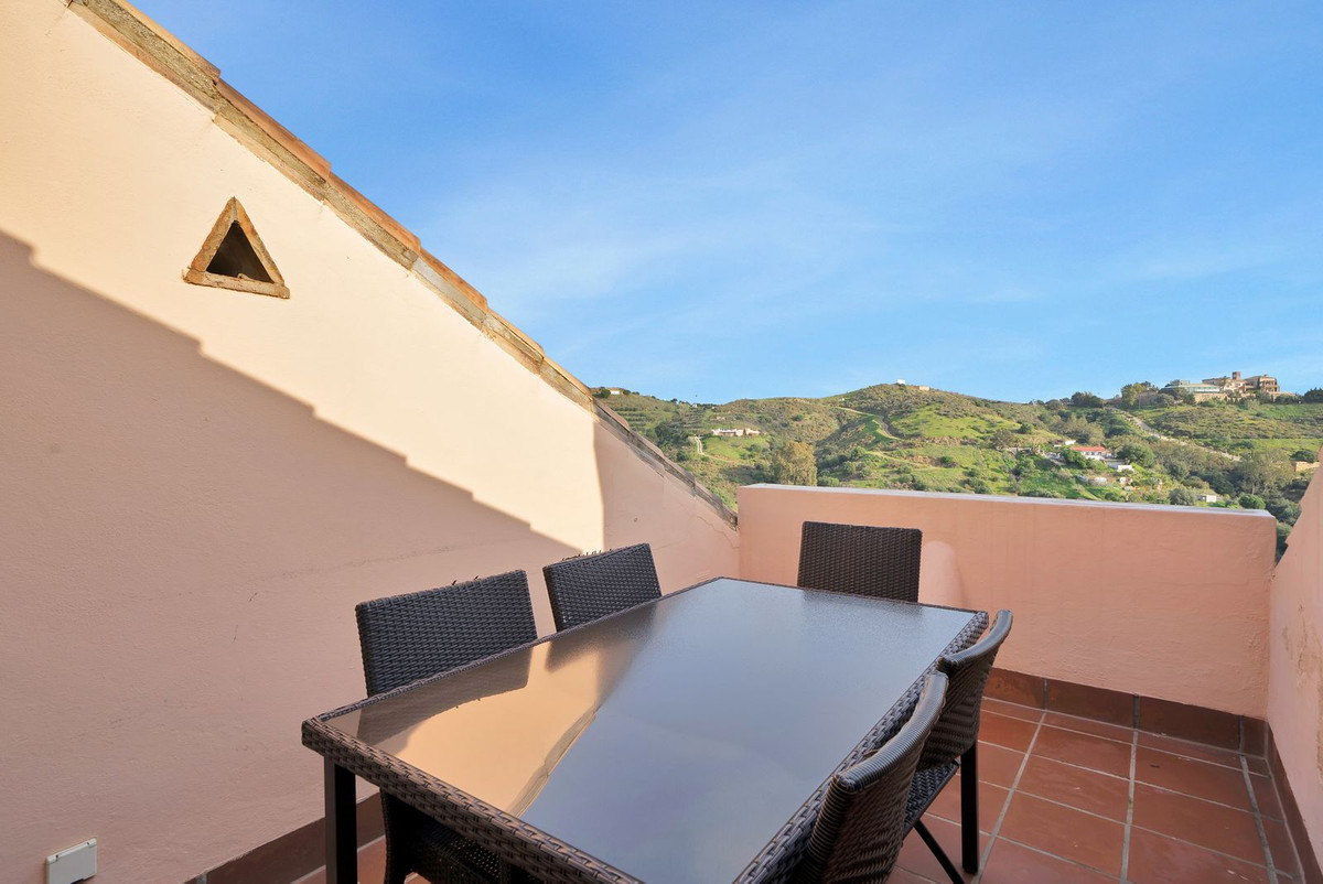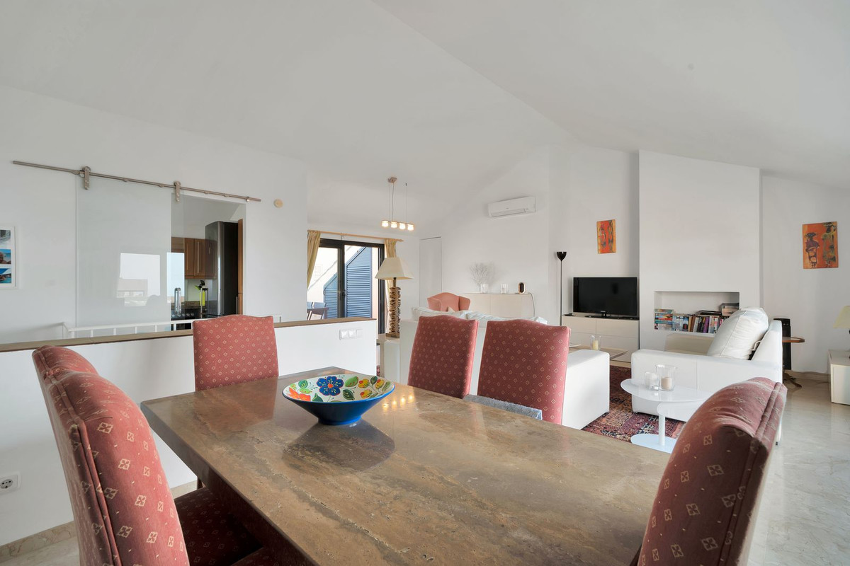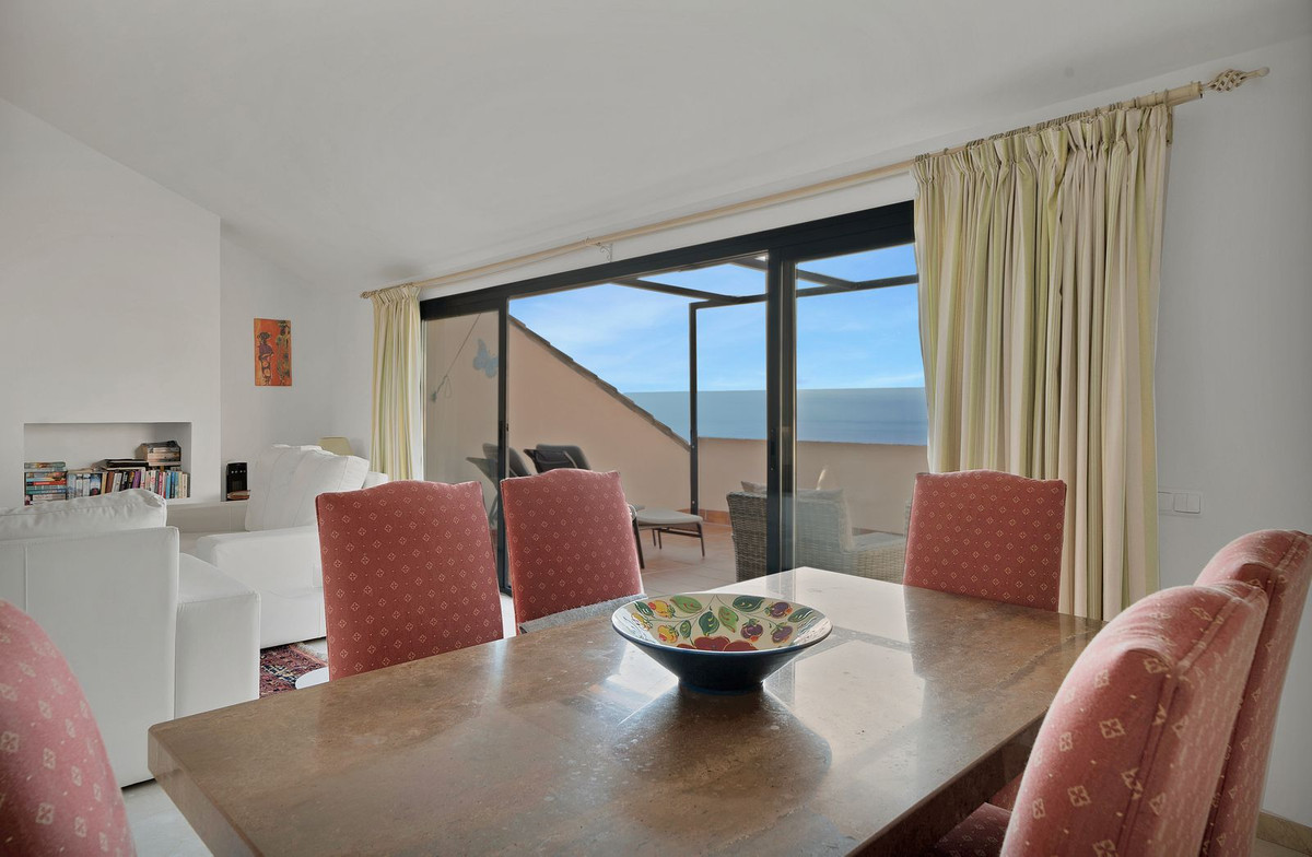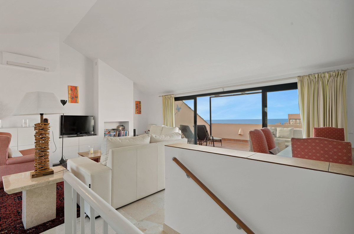 Stunning, spacious, and light duplex penthouse with sea and mountain views. The complex is very well-maintained, with two beautiful swimming pools and beautifully landscaped gardens surrounding it. Upon entering, there are three very spacious bedrooms and two bathrooms. Two of the bedrooms open onto a very large covered terrace with sea views. The upper floor has terraces on both sides, one with sea views and the other with mountain views. The living room is spacious with the option to use the fireplace. Due to the many windows and its location, the apartment is very bright. It is situated in the higher part of Calahonda, which ensures phenomenal views and a peaceful atmosphere. This apartment is ideal as a second home since it is close to golf courses, tennis clubs, and the beautiful coastline. Renting is prohibited, so it is always quiet, allowing you to enjoy the pool without any noise from renters. We would be happy to show you this apartment
