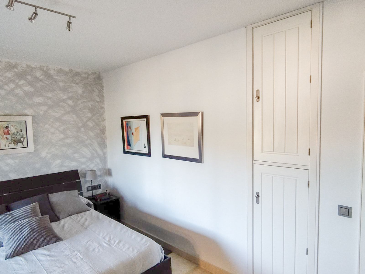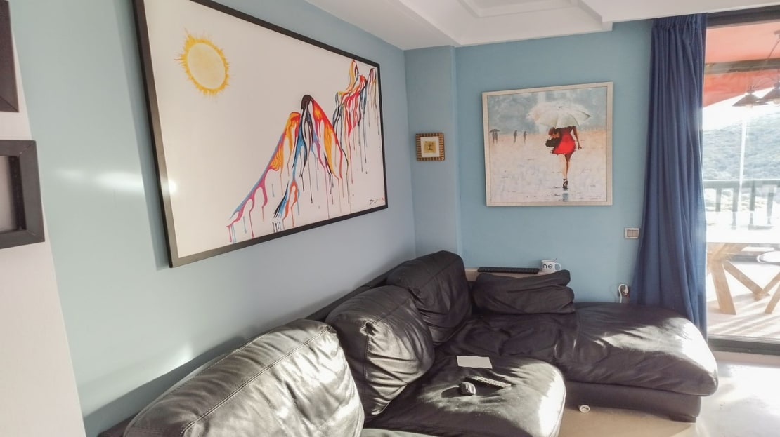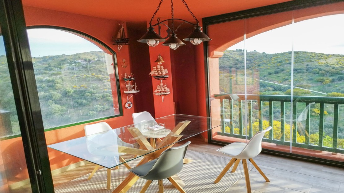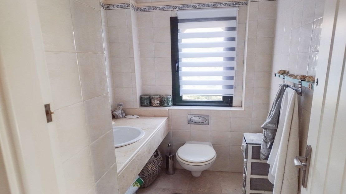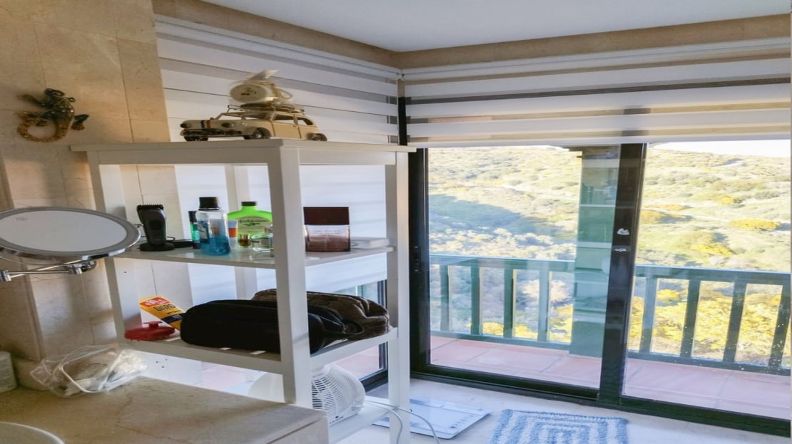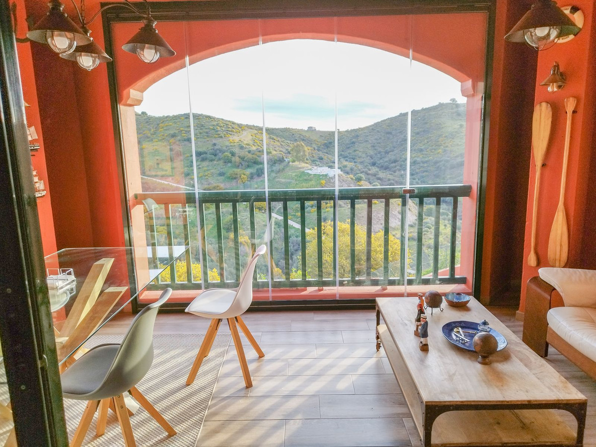 On the first floor we find a bright and spacious living room and dining area, with a fully equiped kitchen with storage and laundry space. From the living room we access its cozy terrace overlooking the amazing views that the area has to offer. The terrace is closed with glass courtains that can be opened up fully.