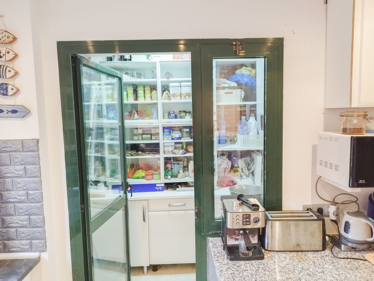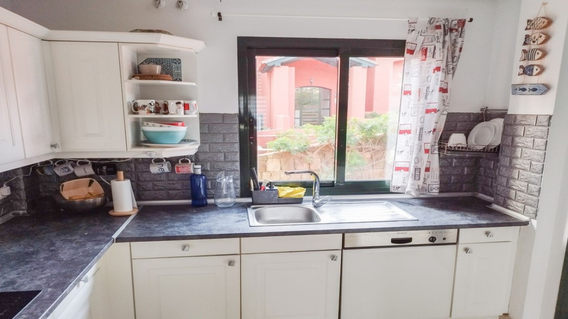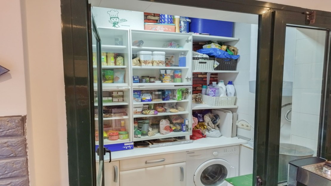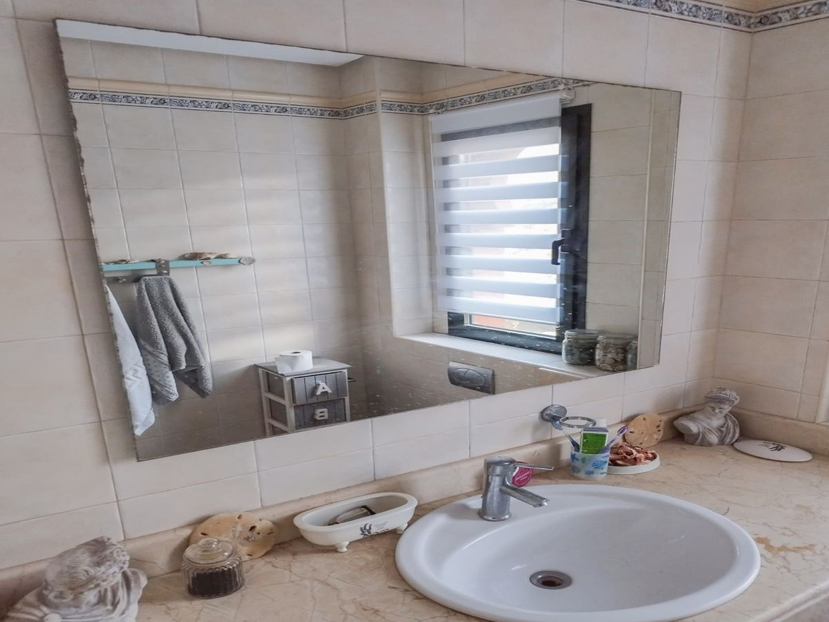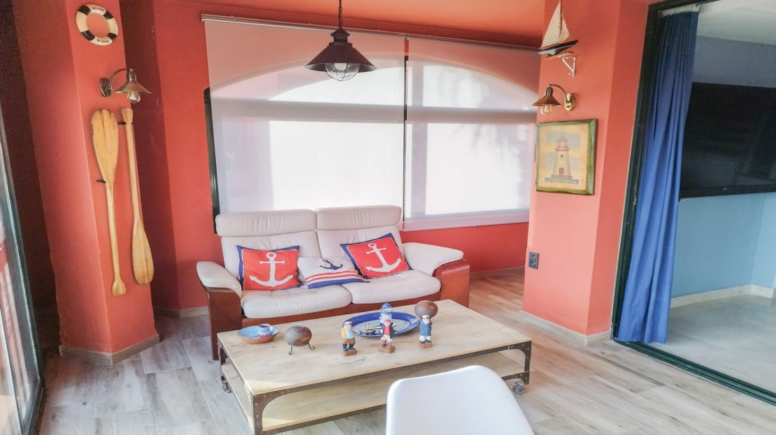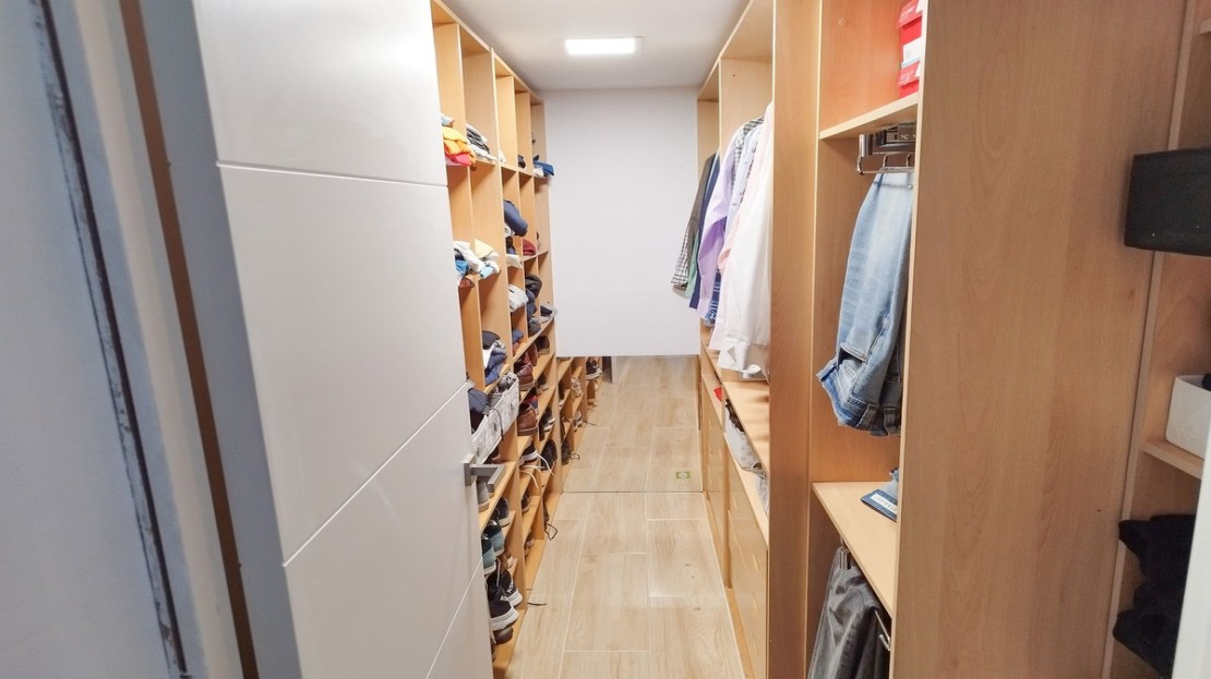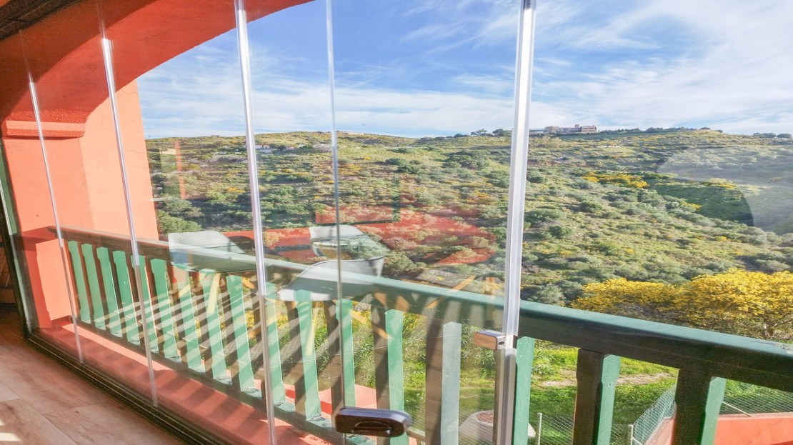 On the first floor we find a bright and spacious living room and dining area, with a fully equiped kitchen with storage and laundry space. From the living room we access its cozy terrace overlooking the amazing views that the area has to offer. The terrace is closed with glass courtains that can be opened up fully.