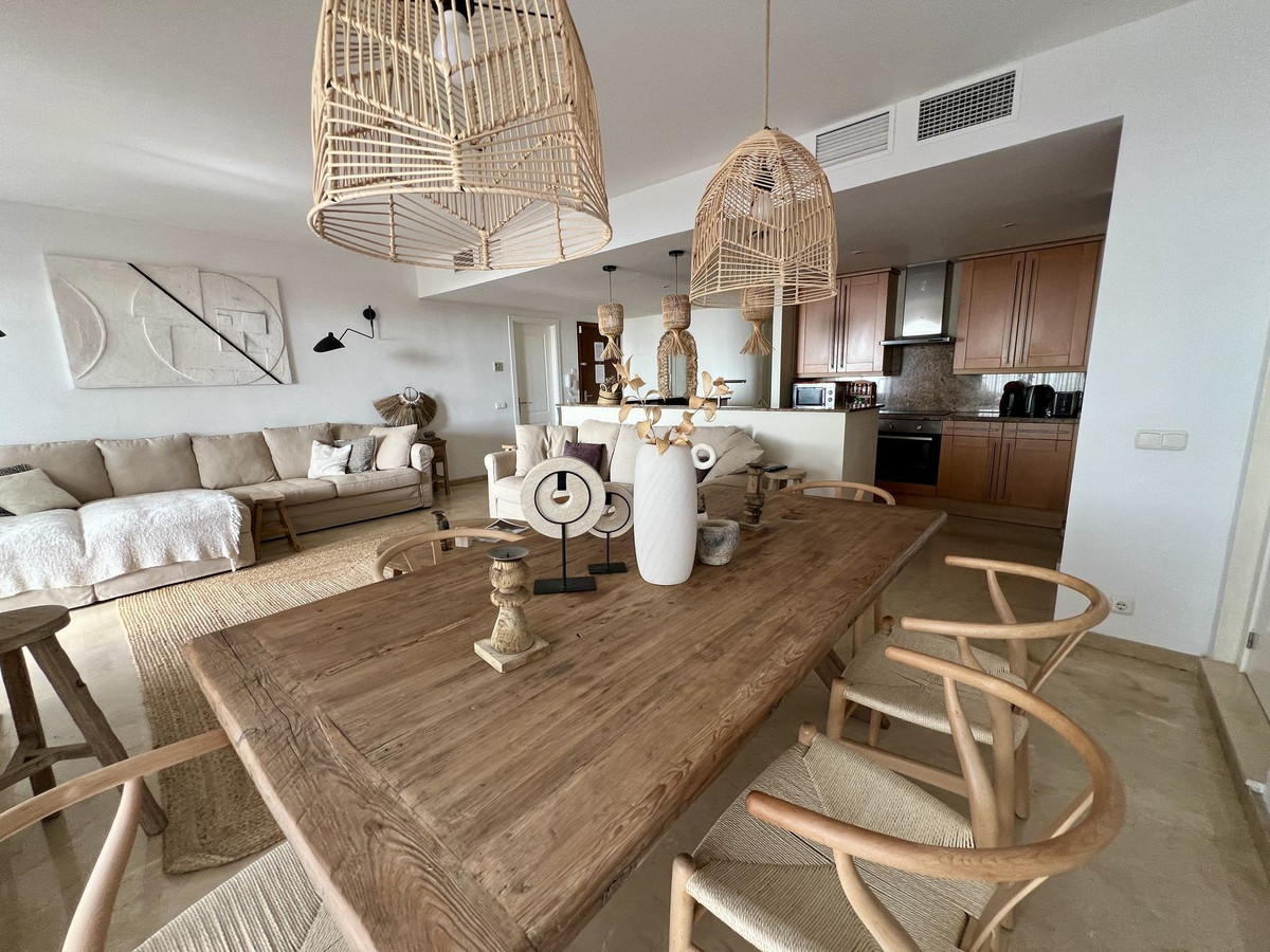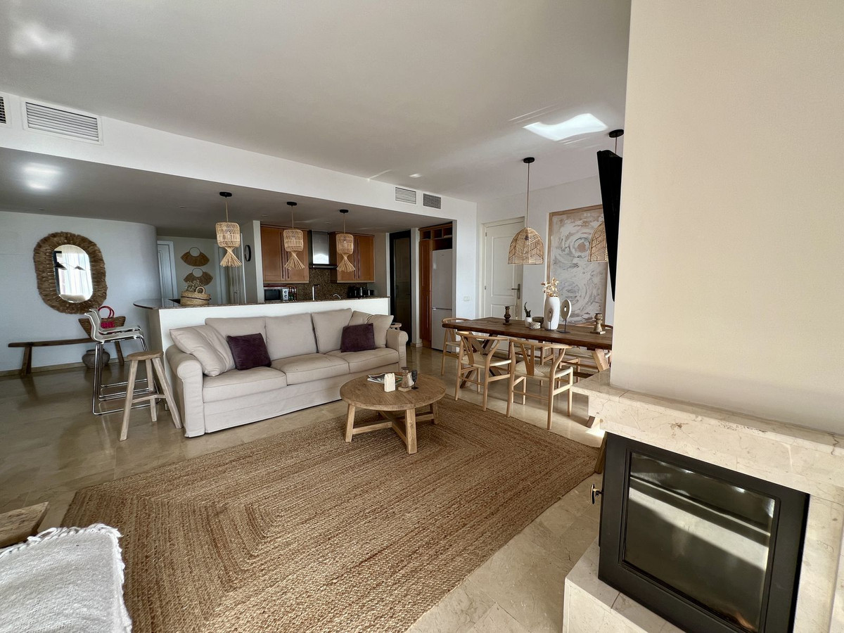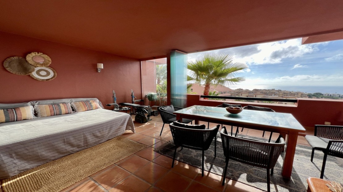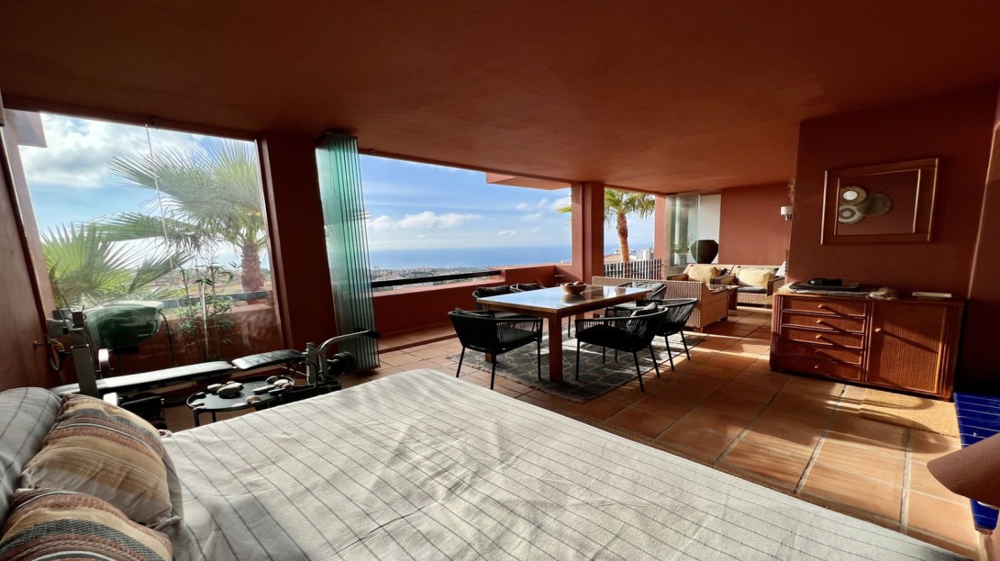 The spacious, sunlit living and dining area features dual-aspect, double-glazed windows that open onto a vast private terrace. This expansive outdoor space is perfect for entertaining or unwinding, with room for a complete lounge suite, a six-seater dining set, and a built-in BBQ/fire pit—ideal for enjoying panoramic views of the Mediterranean Sea, stretching to Gibraltar and beyond.