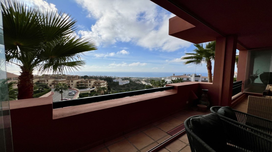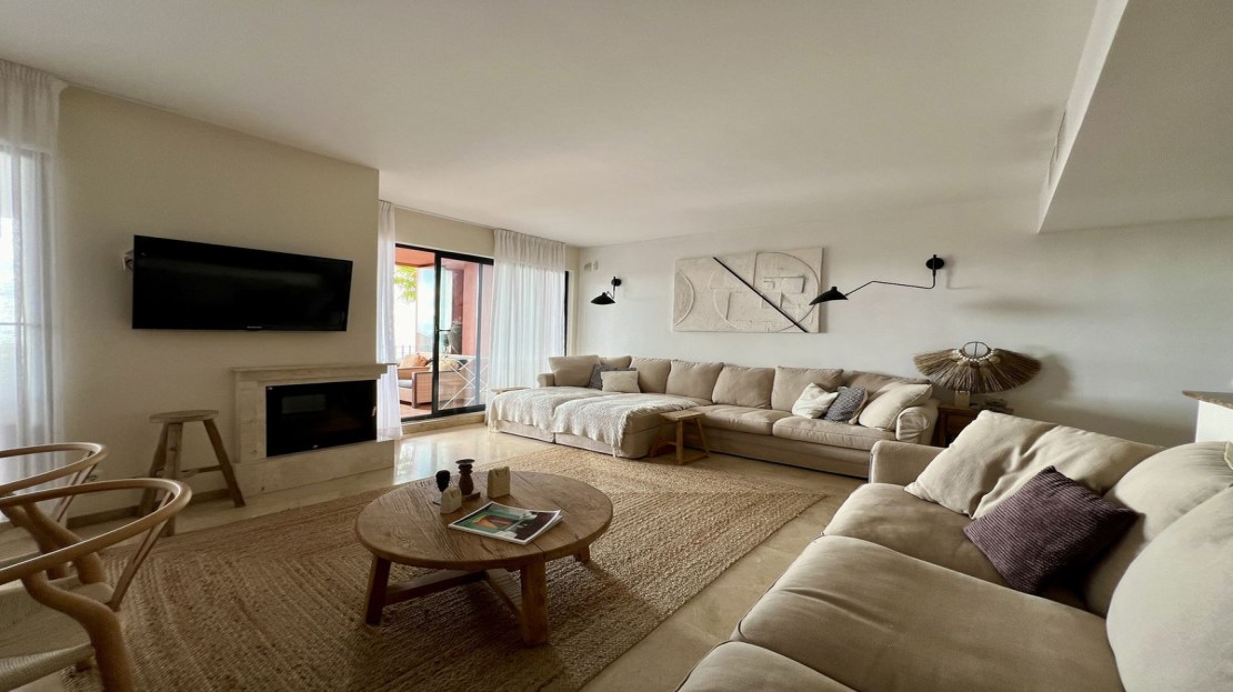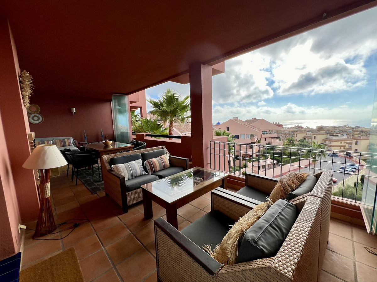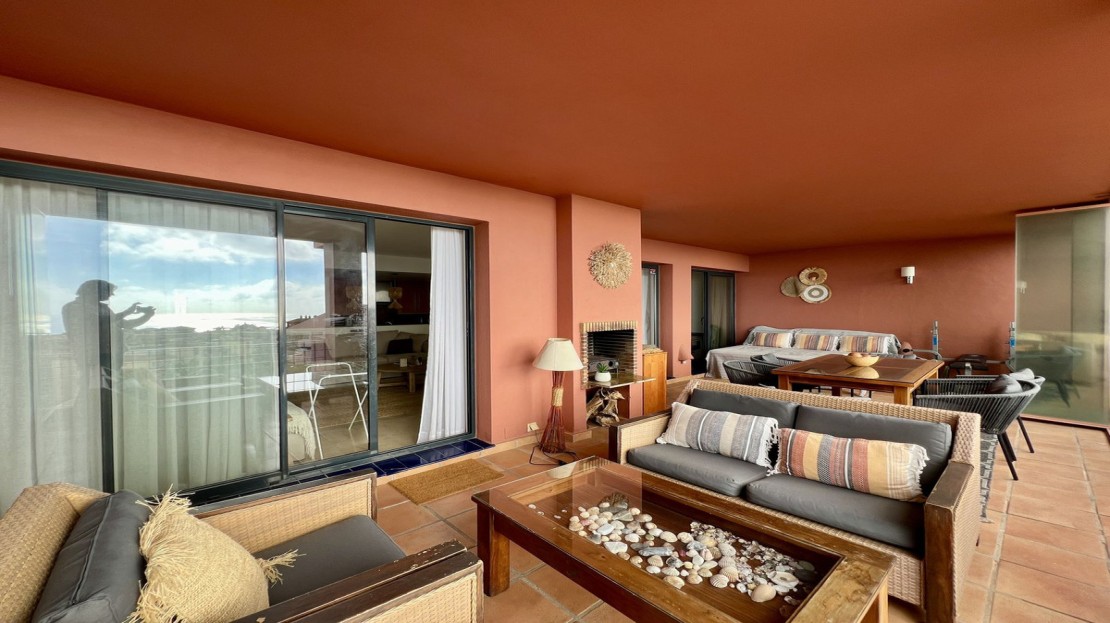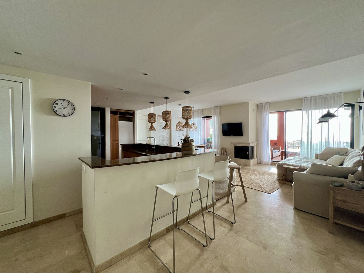 The spacious, sunlit living and dining area features dual-aspect, double-glazed windows that open onto a vast private terrace. This expansive outdoor space is perfect for entertaining or unwinding, with room for a complete lounge suite, a six-seater dining set, and a built-in BBQ/fire pit—ideal for enjoying panoramic views of the Mediterranean Sea, stretching to Gibraltar and beyond.