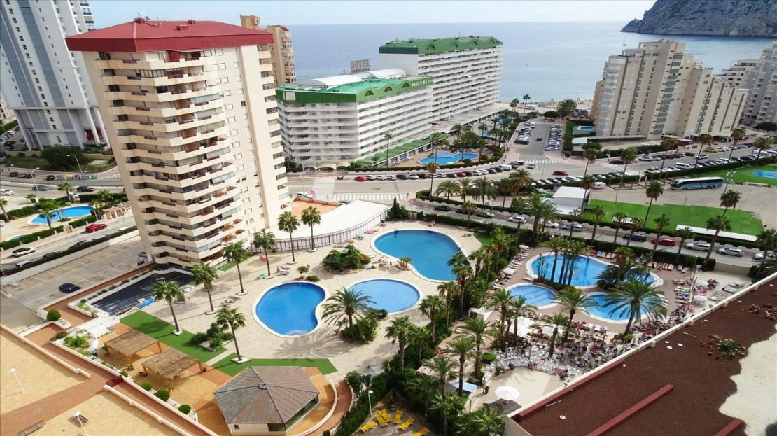 The building has elevators, communal swimming pools, and a concierge.