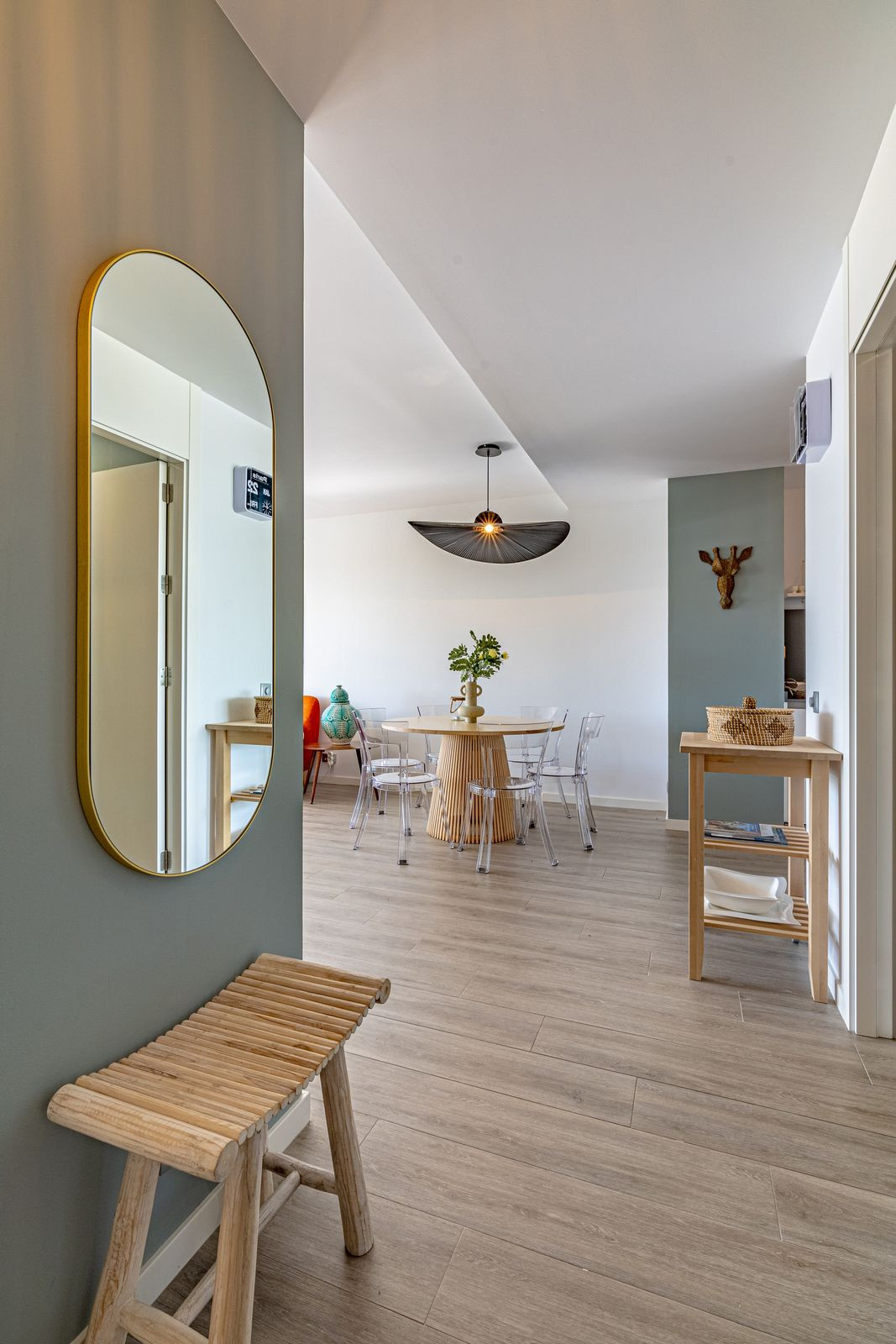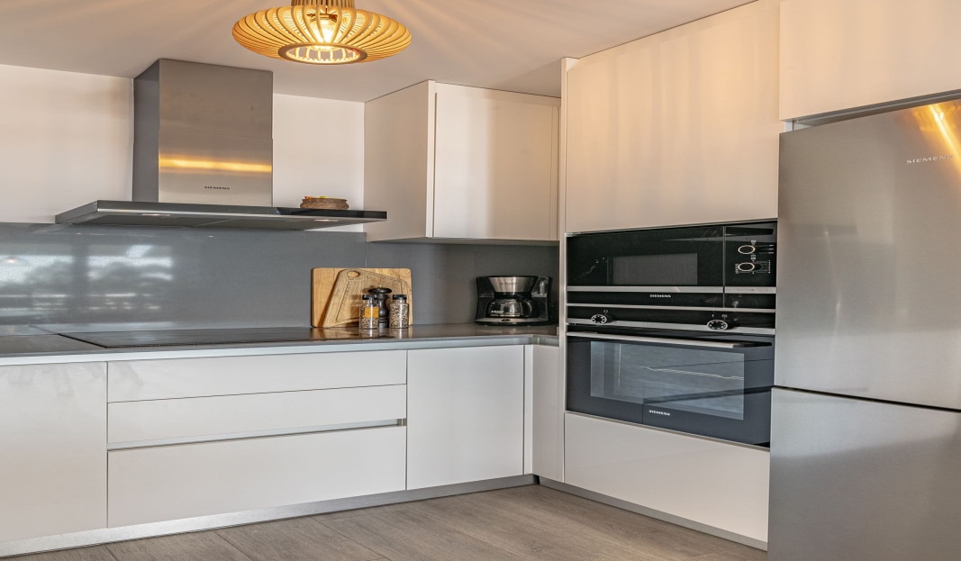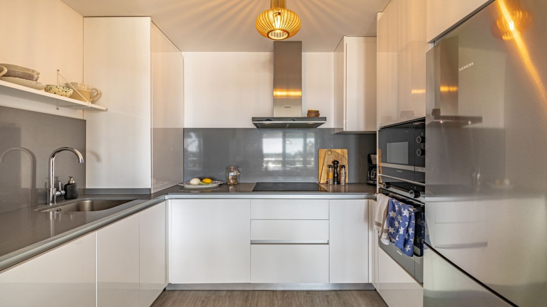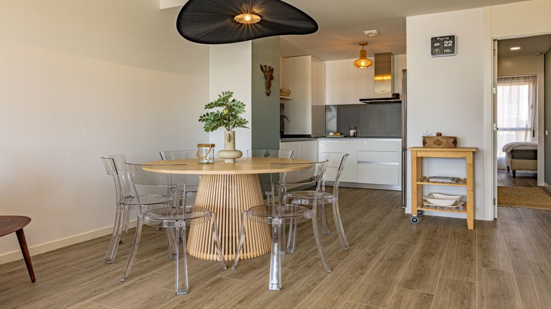 The kitchen is modern and fully equipped, featuring sleek finishes. Adjacent to it, the dining area is perfect for both everyday meals and gatherings with family and friends.
