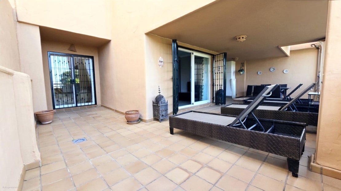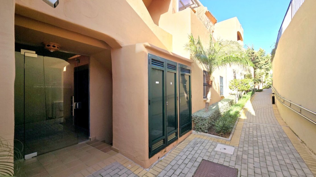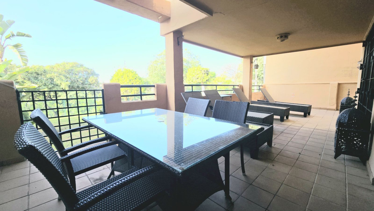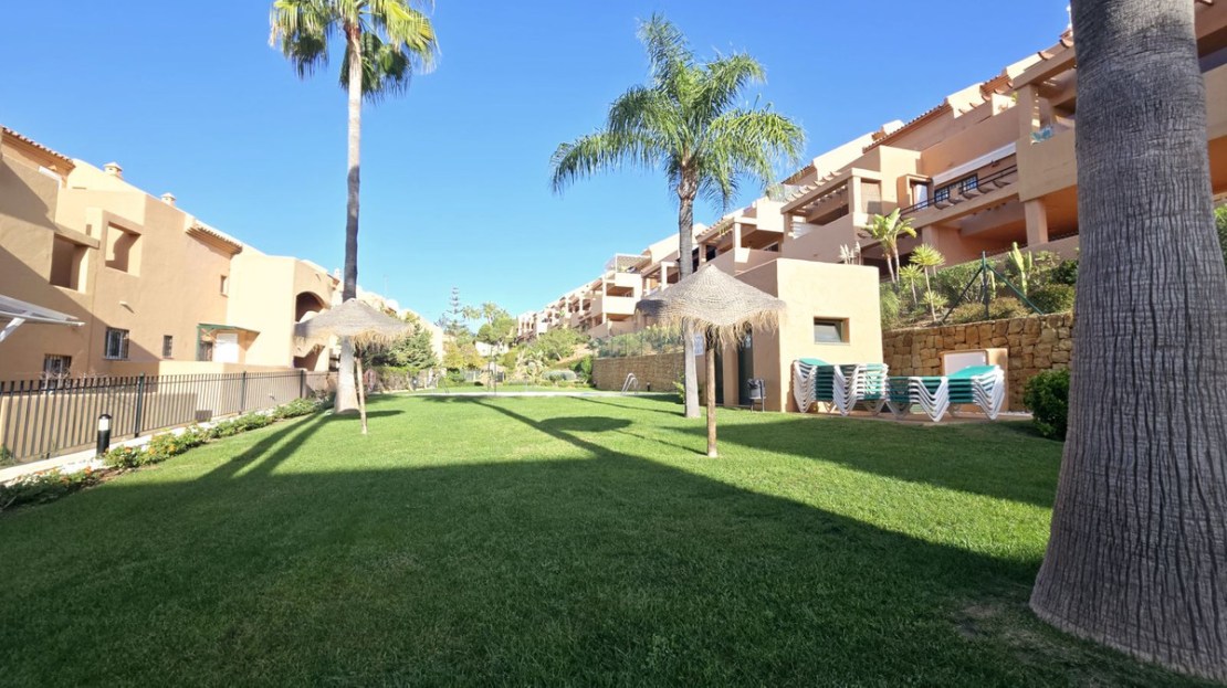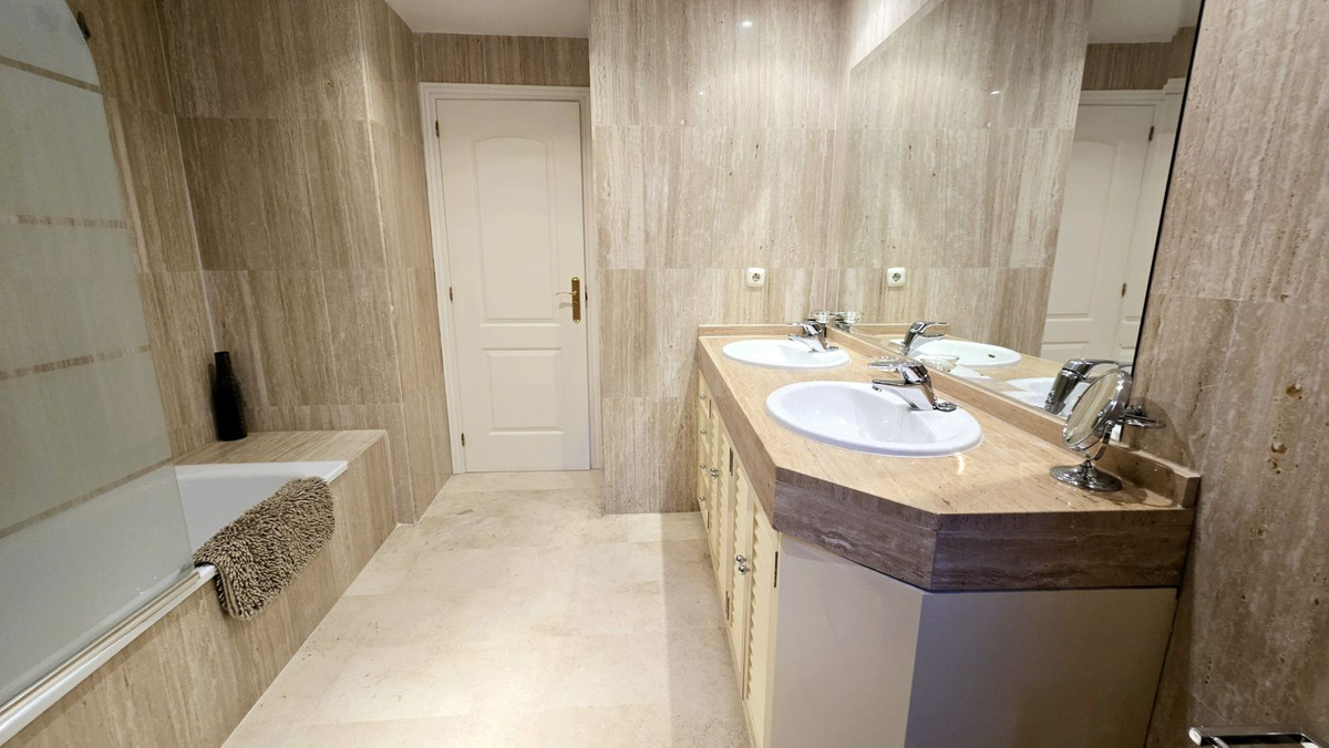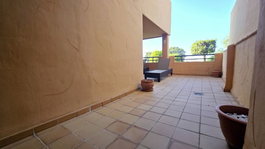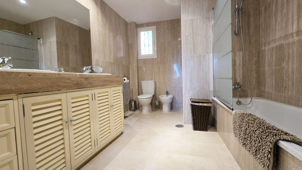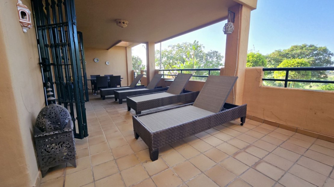This comfortable fully furnished, 3-bedroom corner apartment including 2.5 bathrooms. Quality marbel flooring throughout, including marble wall coverings in all bathrooms. The apartment is situated within walking distance to the famous Santa Maria Golf course and is close to many others. The apartment itself is in excellent condition and has been well loved and looked after by the owners. The terrace is huge and L shaped, with sun loungers, dining table and chairs, with the addition of a gate allowing access to a large green area. SW facing with sea views and not overlooked, so private and functional.