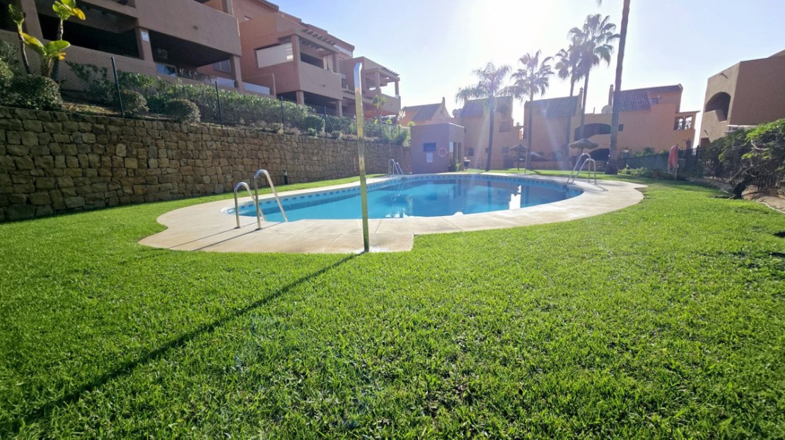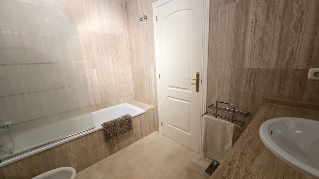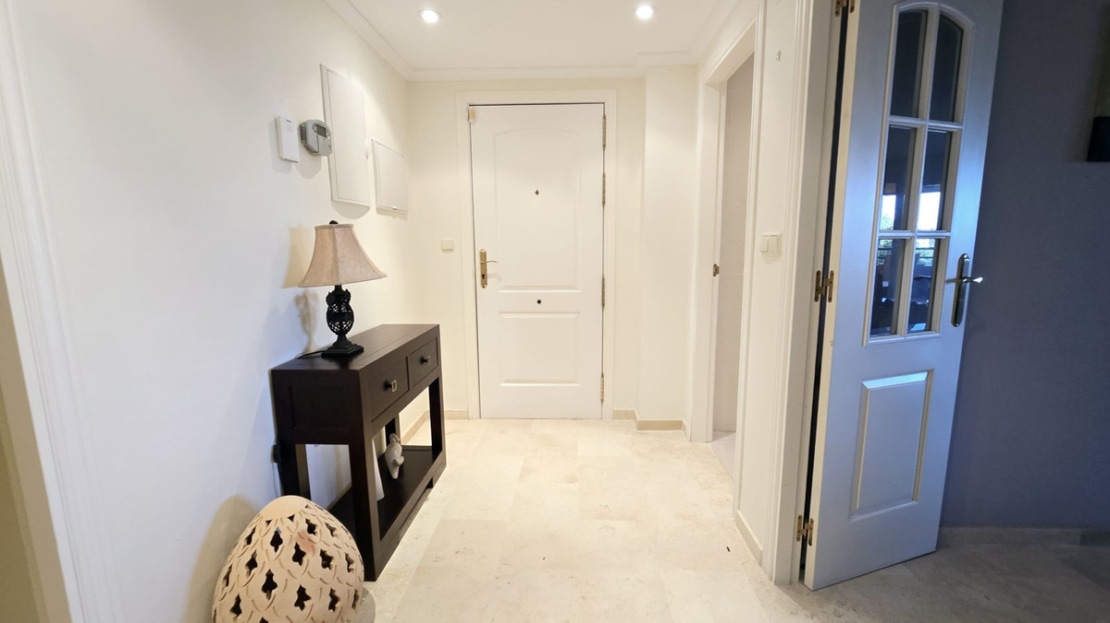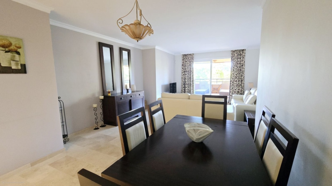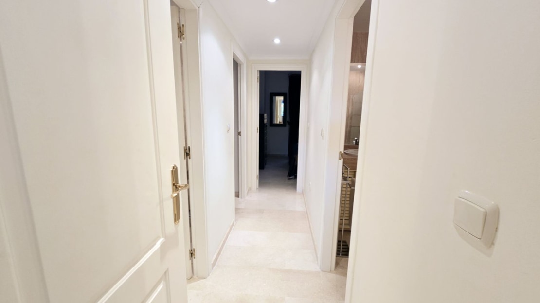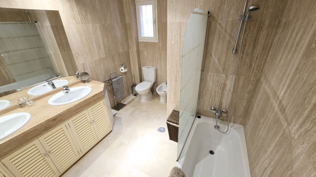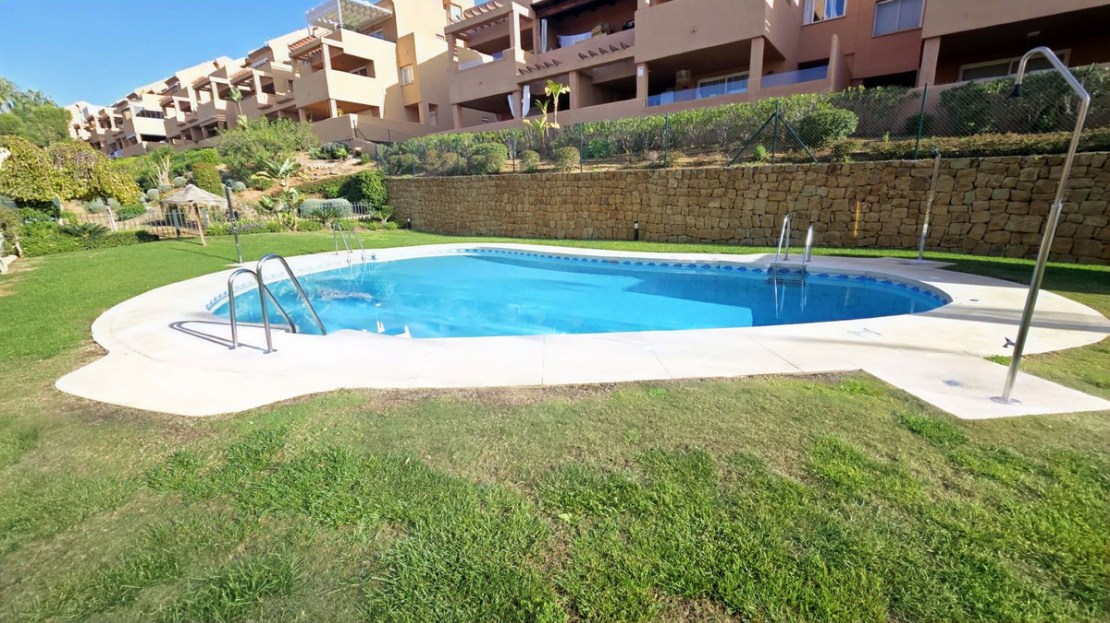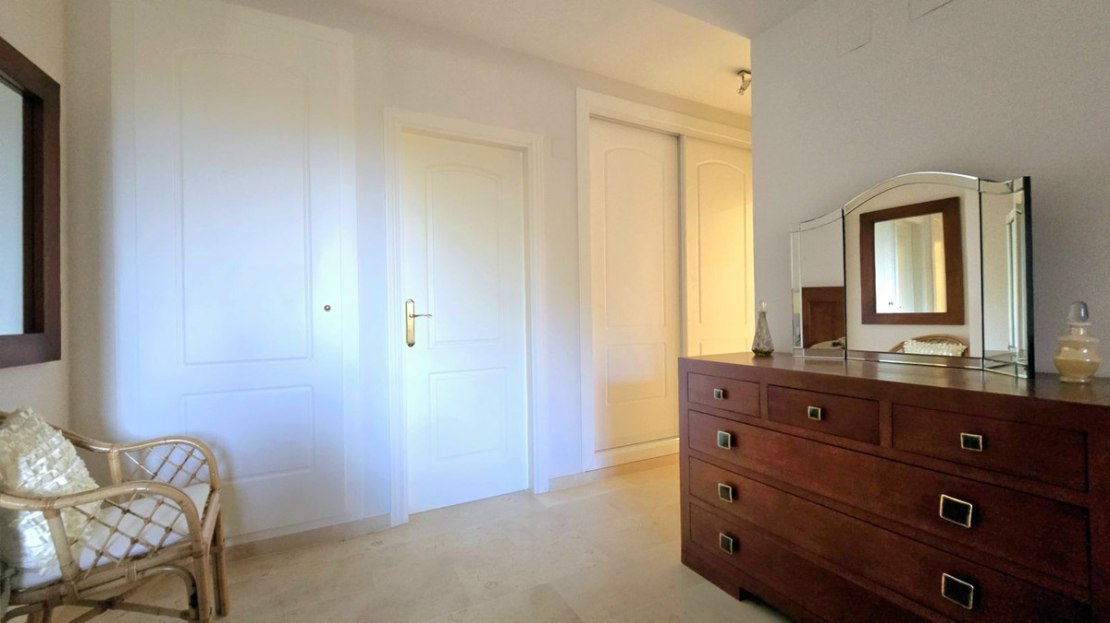 This comfortable fully furnished, 3-bedroom corner apartment including 2.5 bathrooms. Quality marbel flooring throughout, including marble wall coverings in all bathrooms. The apartment is situated within walking distance to the famous Santa Maria Golf course and is close to many others. The apartment itself is in excellent condition and has been well loved and looked after by the owners. The terrace is huge and L shaped, with sun loungers, dining table and chairs, with the addition of a gate allowing access to a large green area. SW facing with sea views and not overlooked, so private and functional.