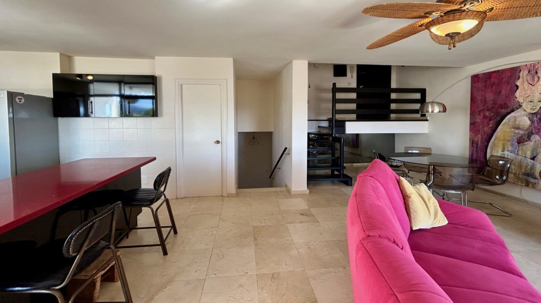 The apartment has a two-level design, with a short flight of stairs leading to the main living area and another half flight providing access to the private bedroom area. This well-thought-out design creates a subtle separation between day and night areas, adding a sense of privacy and spaciousness to the home.