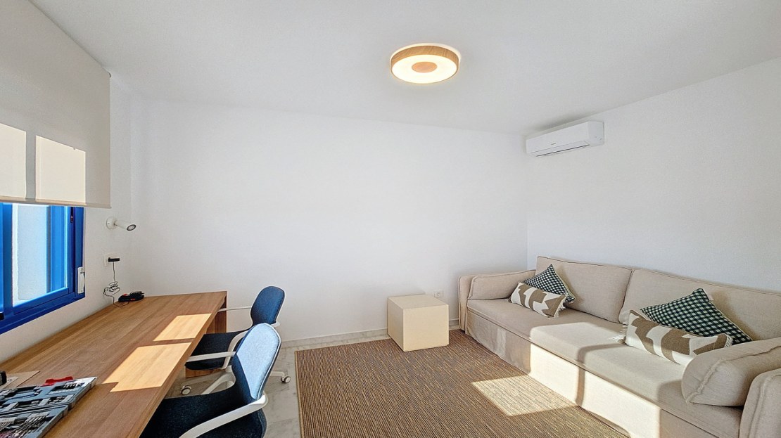 The living room is distinguished by its spaciousness and brightness, thanks to the glass doors leading to a private terrace of 6.78m², perfect for enjoying the Mediterranean climate and open views of the city. The kitchen, with a functional design and fully equipped with modern appliances, is open to the dining area. Adjacent to the living room is an additional room that can be used as an office, cinema room, or additional bedroom. The apartment has 2 full bedrooms with built-in wardrobes. The master bedroom includes an en-suite bathroom, providing a touch of privacy and comfort. The bathrooms are equipped with elegant and modern finishes.