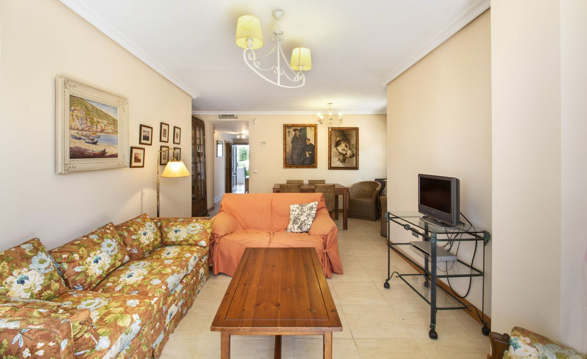 Spacious living/dining room with direct access to the terrace and the huge private garden with partial sea views located in the sought after area of La Resina Golf & Country Club.