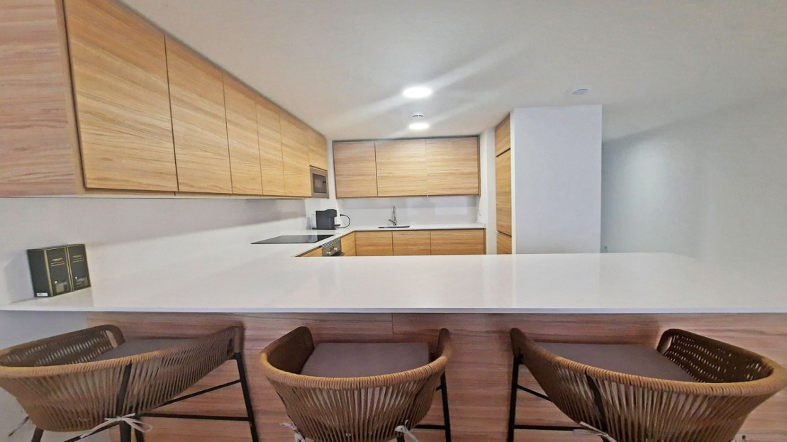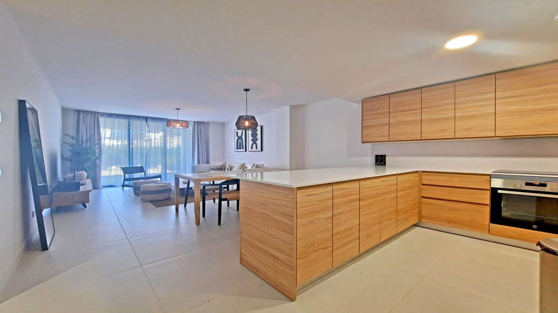 The open kitchen is a chef’s delight, fully fitted with top-of-the-line appliances. Its sleek design and functionality make it perfect for both casual meals and entertaining guests.