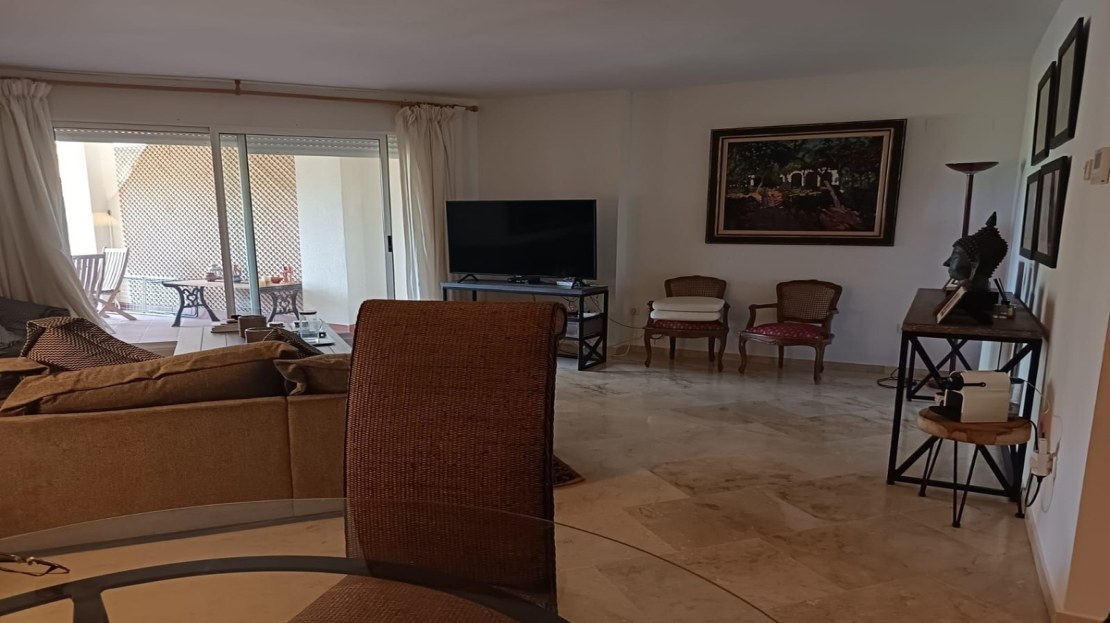We’re very excited to present you this ground floor frontline golf apartment in Guadalmina Alta. It has 3 bedrooms and 2 bathrooms, spacious living and dining rooms, a big kitchen. It also has an underground parking space and a storage room. There are also 2 community pools.
