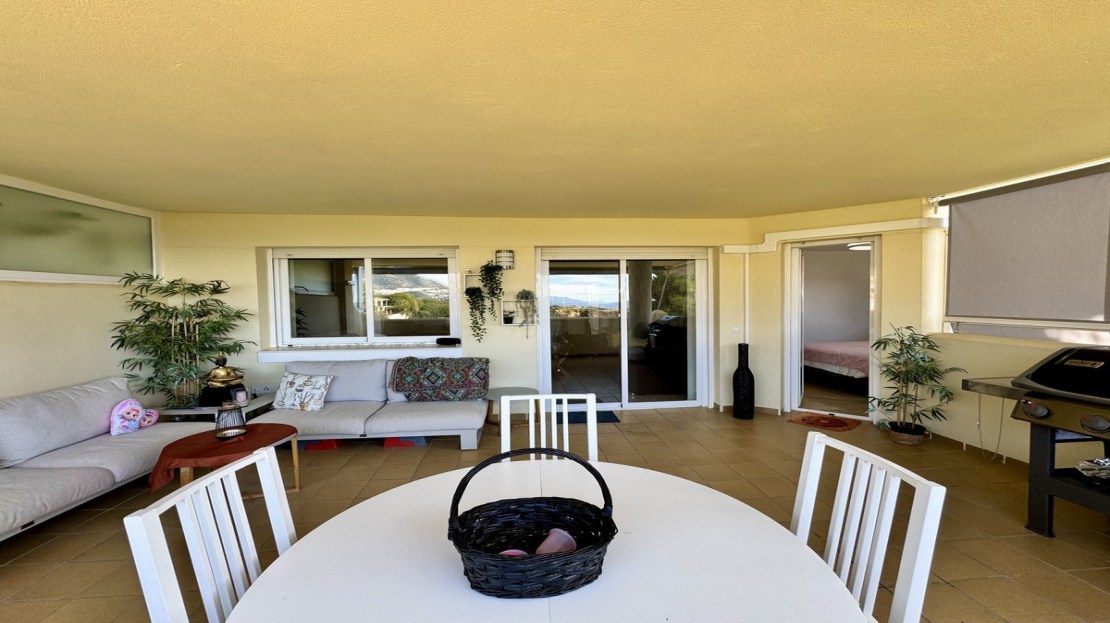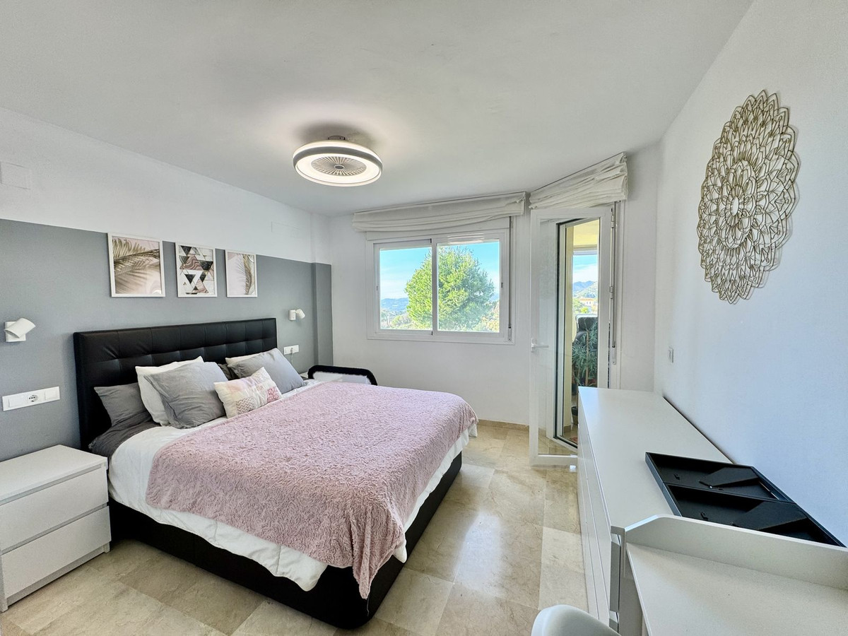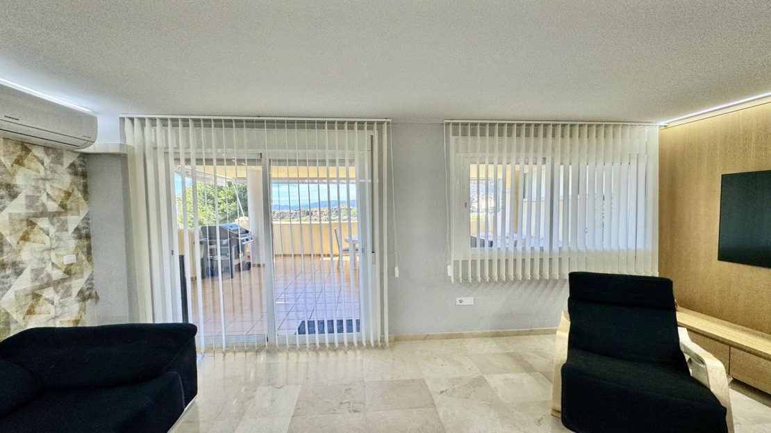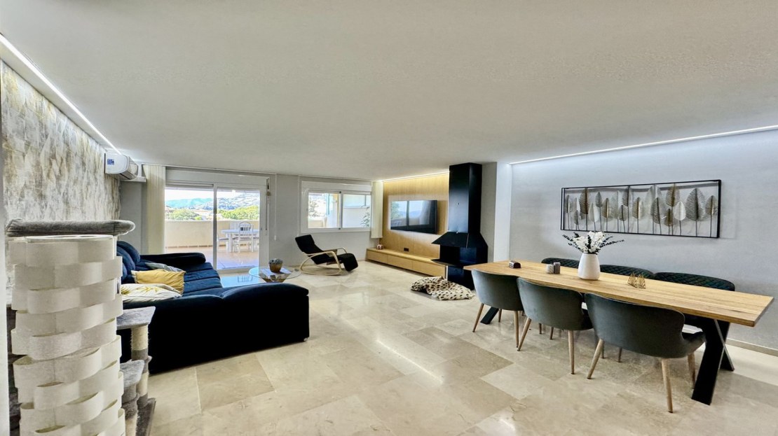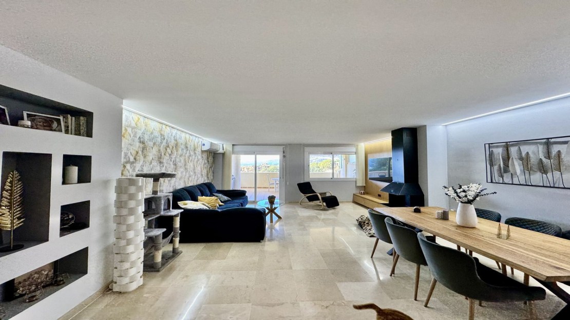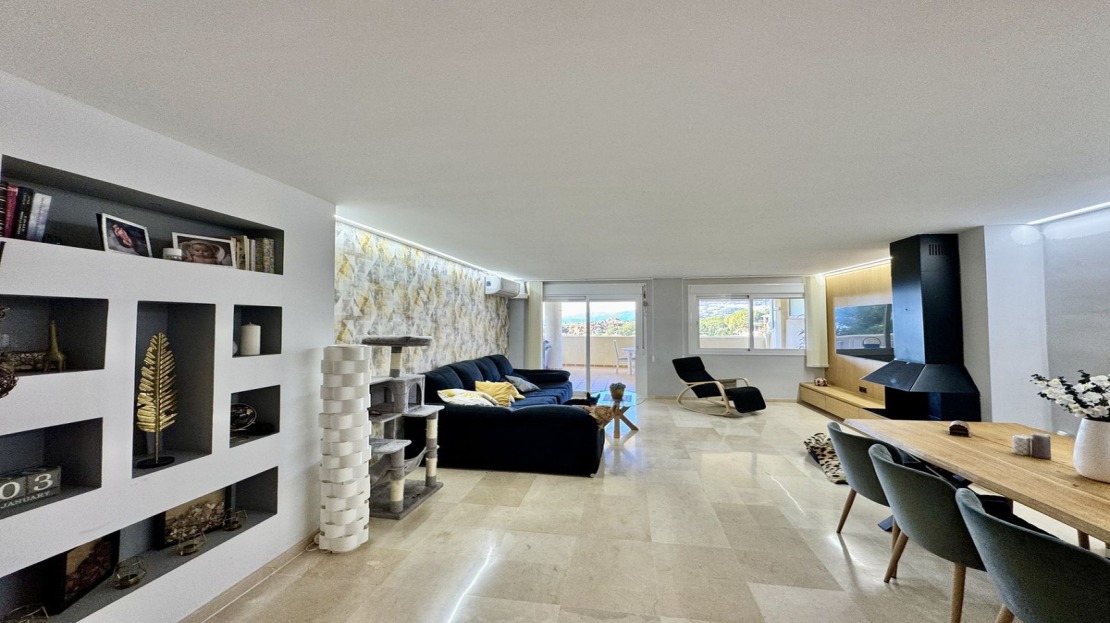 The flat has 3 spacious bedrooms, all with built-in wardrobes and capacity to adapt to any need. The 2 bathrooms, one of them en-suite, have been renovated with quality finishes. There is also a guest toilet, which offers comfort and privacy. The very spacious living room integrates perfectly with the open plan kitchen, creating an ideal environment for both everyday living and entertaining. The terrace is another of the property's great attractions, with a large 28m²º surface area and facing the afternoon sun, making it the perfect place to relax while enjoying the unobstructed views of the mountains. The marble floors bring a timeless elegance to the entire flat, while the double-glazed windows guarantee excellent thermal and acoustic insulation. Furthermore, the property includes a parking space in the price, providing convenience and security in the area. The urbanisation is very well maintained, which contributes to a pleasant and peaceful environment.