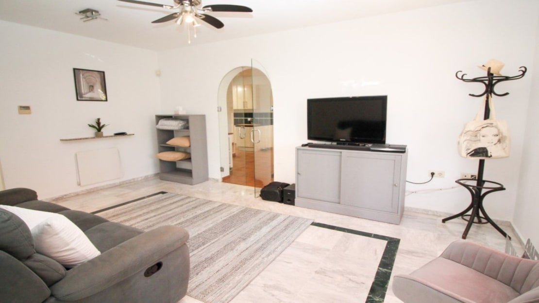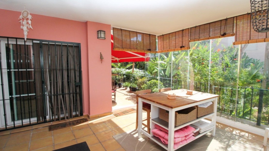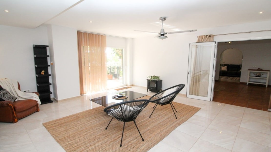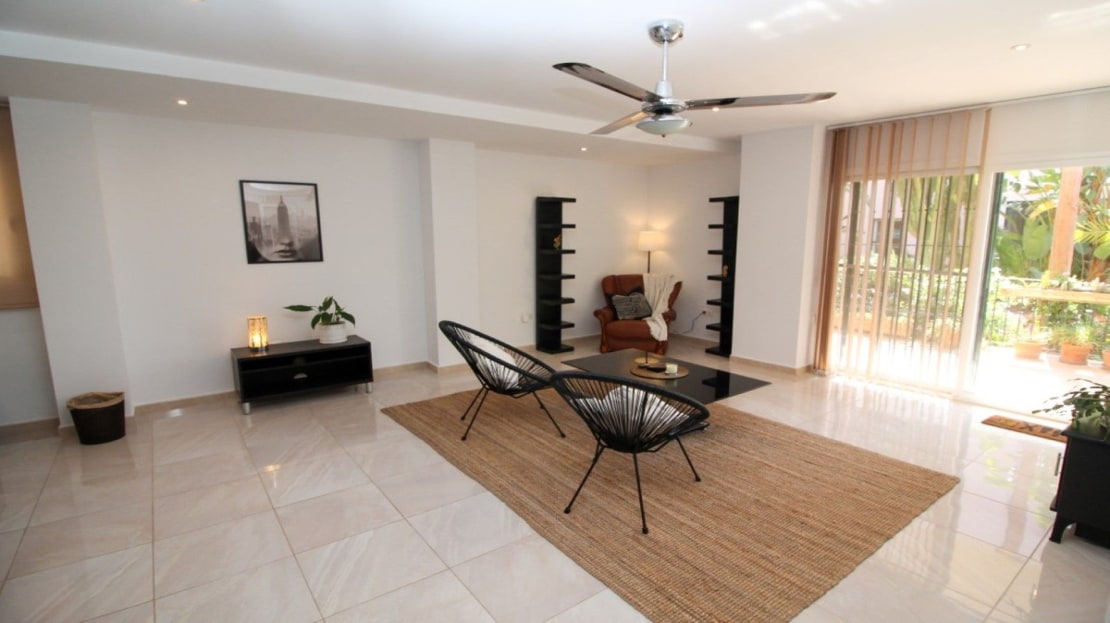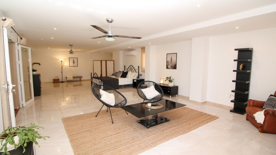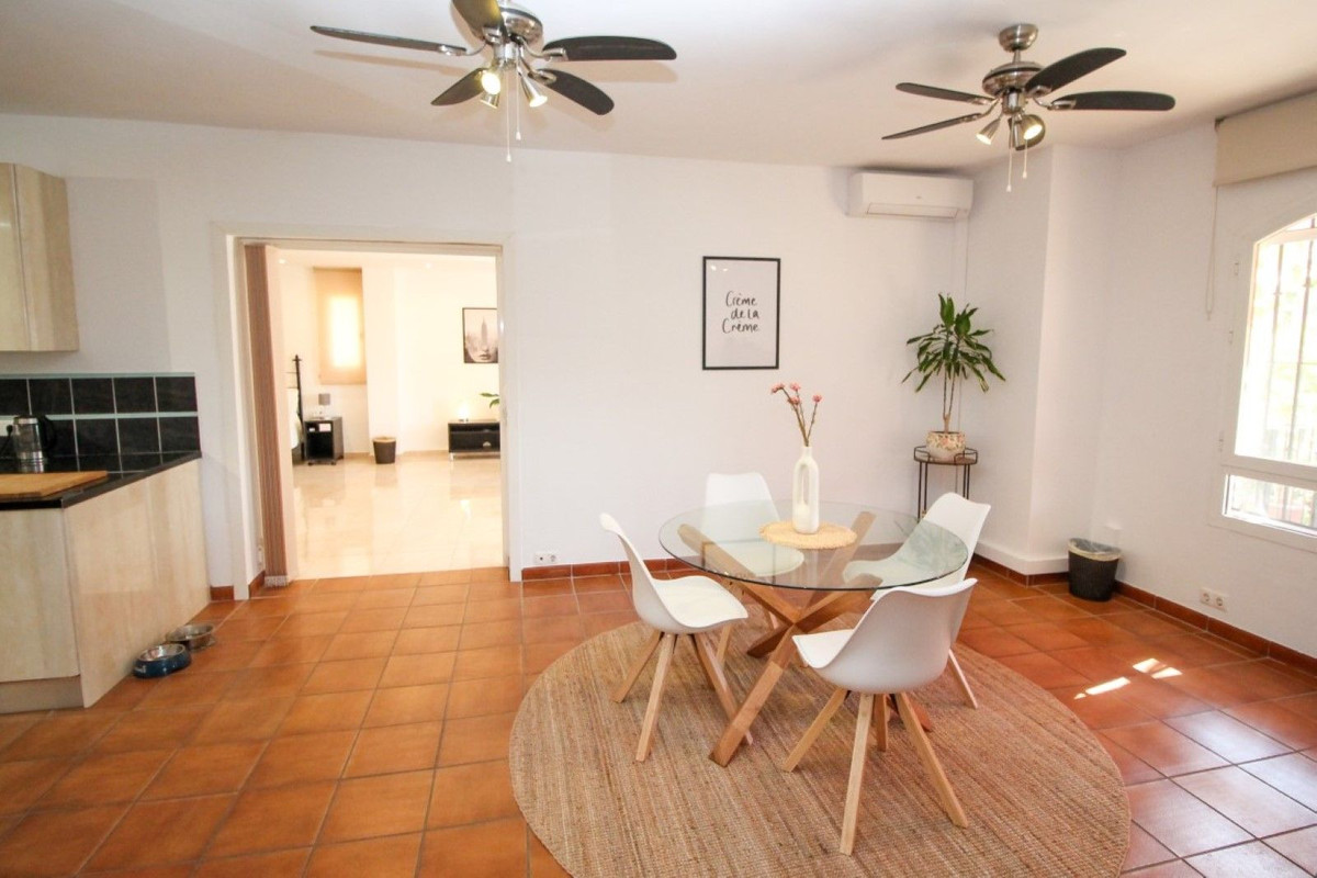 This truly unique and one-of-a-kind property offers an extraordinary living experience. Originally a 2-bedroom, 2-bathroom ground-floor apartment, the current owners have transformed the space by incorporating two adjoining areas, creating a magnificent 3-bedroom home spanning an impressive 294 m², including 105 m² of wrap-around terraces. Surrounded by lush tropical gardens, this fabulous property is nestled within an exclusive gated community in Miraflores, providing a serene and secure lifestyle. The entrance hall leads to the fully equipped utility room, a large lounge area, two double bedrooms both with fitted wardrobes and terrace access, en-suite bathroom and guest bathroom. The large dining area is separated by elegant glass partition doors and seamlessly connects to the open-plan, fully fitted kitchen, ideal for entertaining and family living. From this area access to a further 65m2 area consisting of a huge master bedroom with walk in wardrobe and second lounge area with patio doors leading to the terraces. The 105 m² of wrap-around terraces, surrounded by tropical gardens, provide an ideal setting for outdoor dining, lounging, or simply enjoying the beautiful surroundings. Just a 10-minute walk from Miraflores Golf Club, 10 minutes from the beach, and a 5-minute drive to La Cala de Mijas, this property offers unparalleled convenience. Marbella is also just 15 minutes away. Completed in 2006 this is a highly sought-after development known for its beautifully maintained communal areas, including a large swimming pool and tropical gardens. With easy access to supermarkets, shops, bars, restaurants, and the beach, everything you need is within close reach. This property comes with underground parking and a large storeroom.