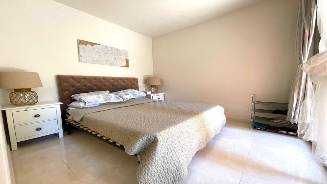 Surrounded by lush, meticulously maintained gardens, the property offers a serene and private atmosphere, complemented by a large communal swimming pool that invites you to cool off during hot summer days. The apartment’s interiors are equally impressive, fully furnished with high-quality pieces that ensure a luxurious and comfortable living experience from the moment you step inside.