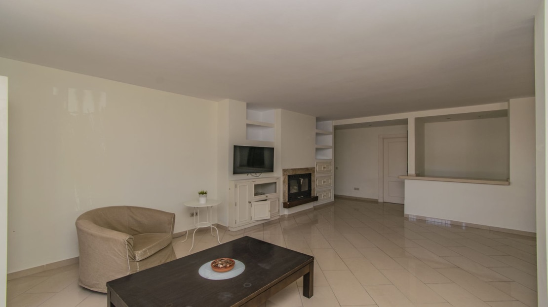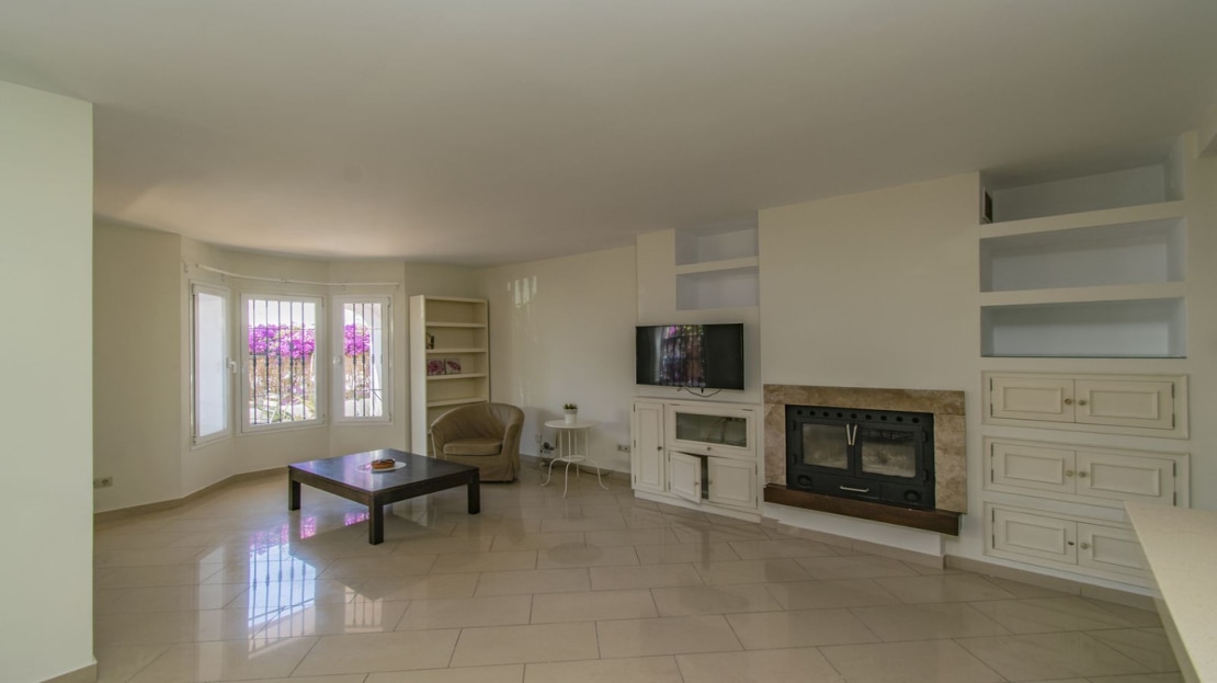 Large property on the ground floor, consisting of three bedrooms, two bathrooms, large living room with fireplace, open kitchen and south-facing terrace.