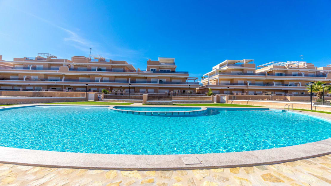 This attractive flat is located in Torre de La Horadada, just 350 meters from the popular beach “Playa de Las Higuericas”. It is part of the exclusive urbanisation Vista Azul XXXVI, which offers a fantastic communal area with a refreshing swimming pool and a heated jacuzzi.