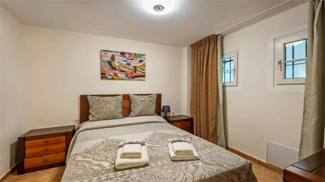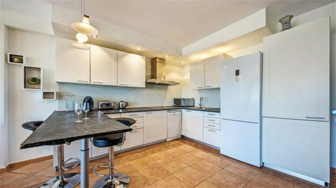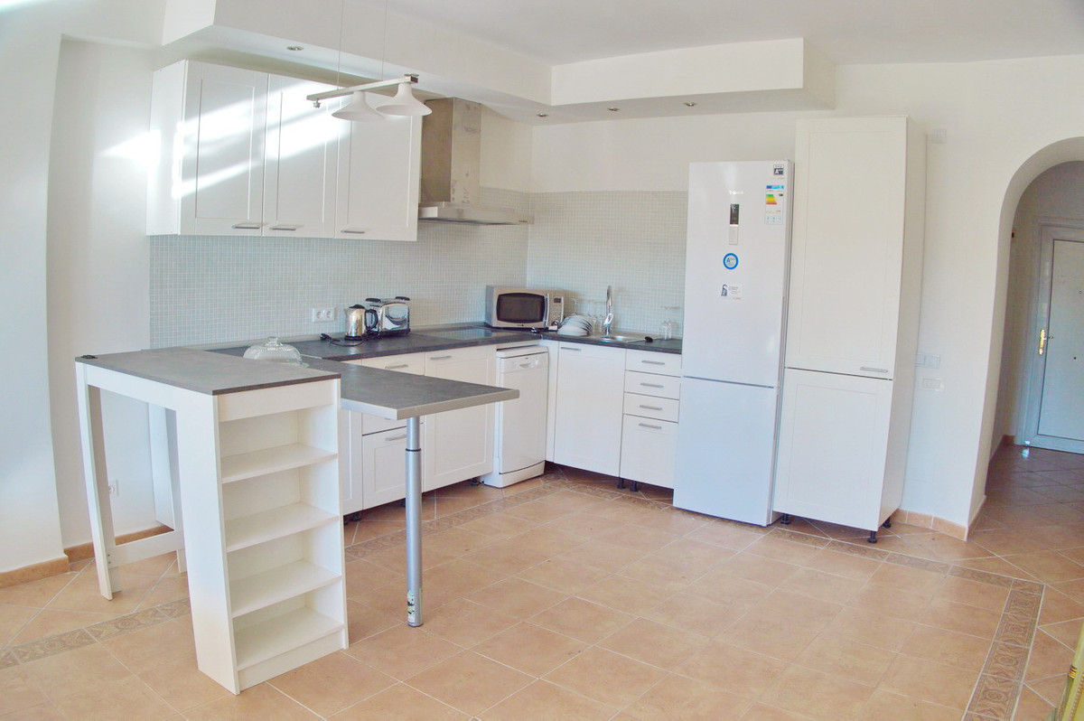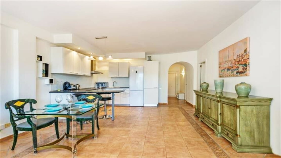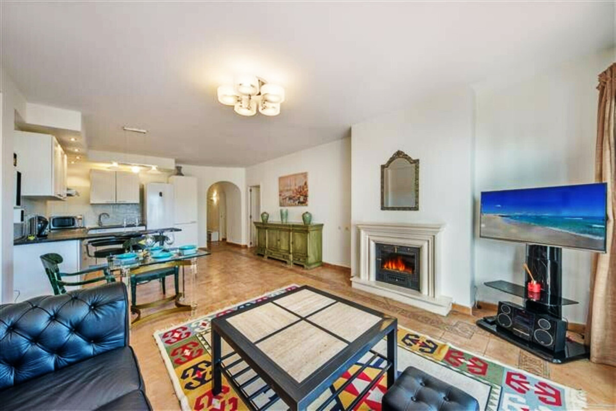 The property offers spacious lounge/dining with fire place, open plan new kitchen , direct access to a south faced terrace with pool view, master bedroom with en suite bathroom and two guest bedrooms with bathroom.