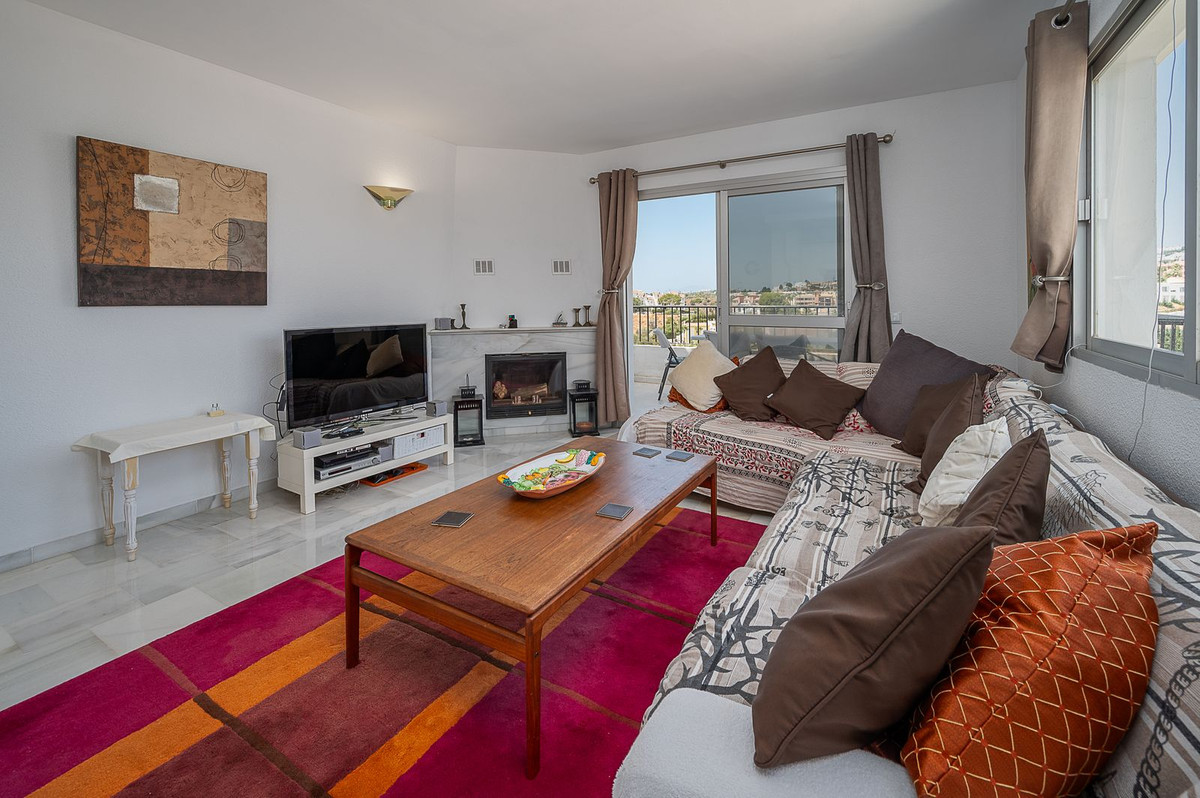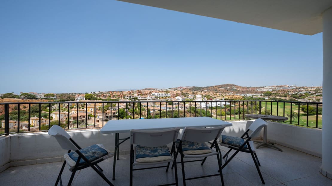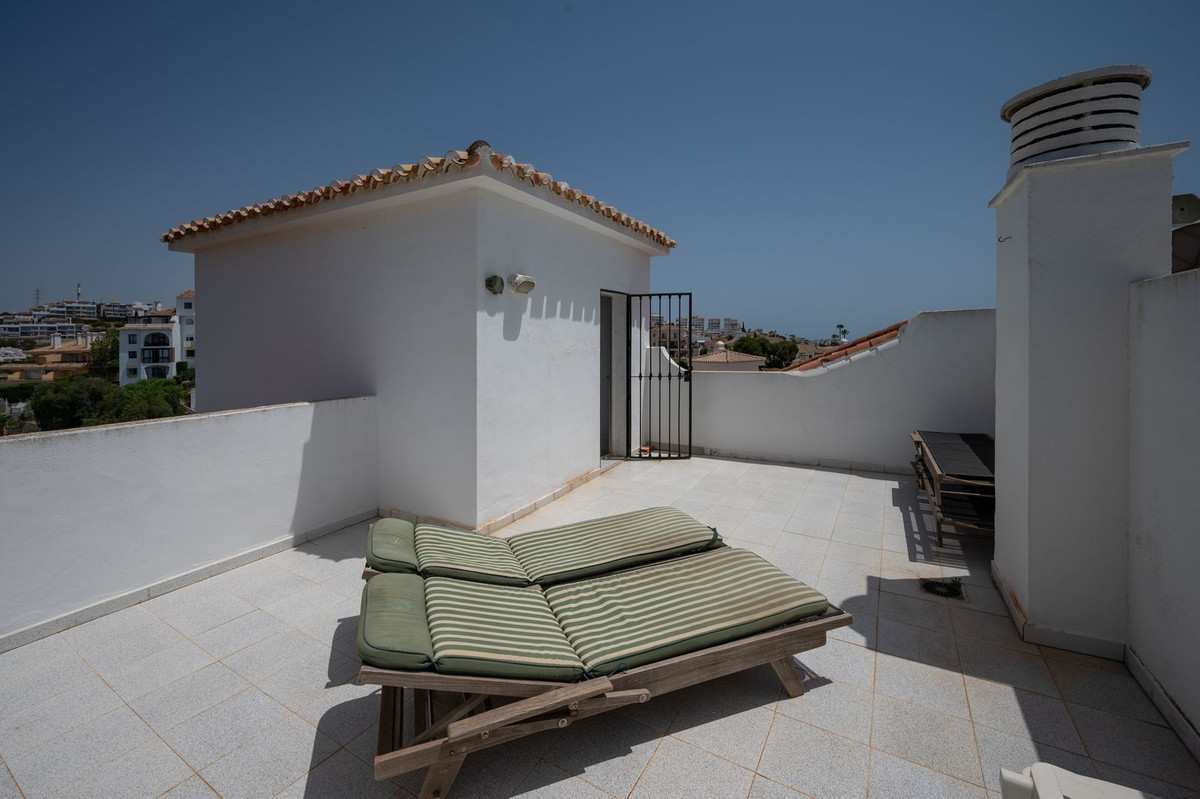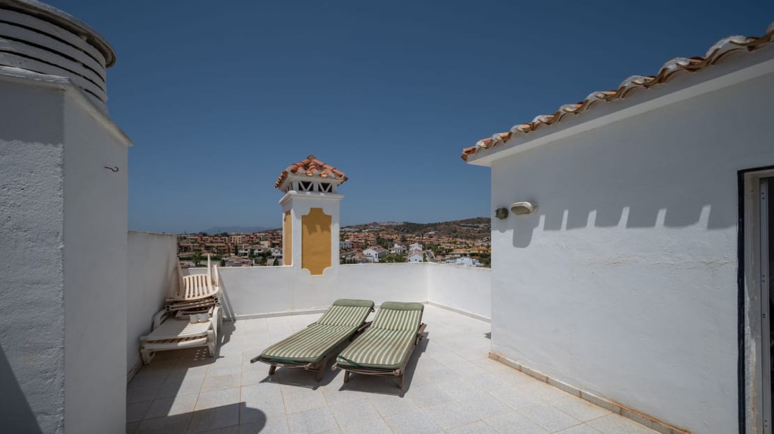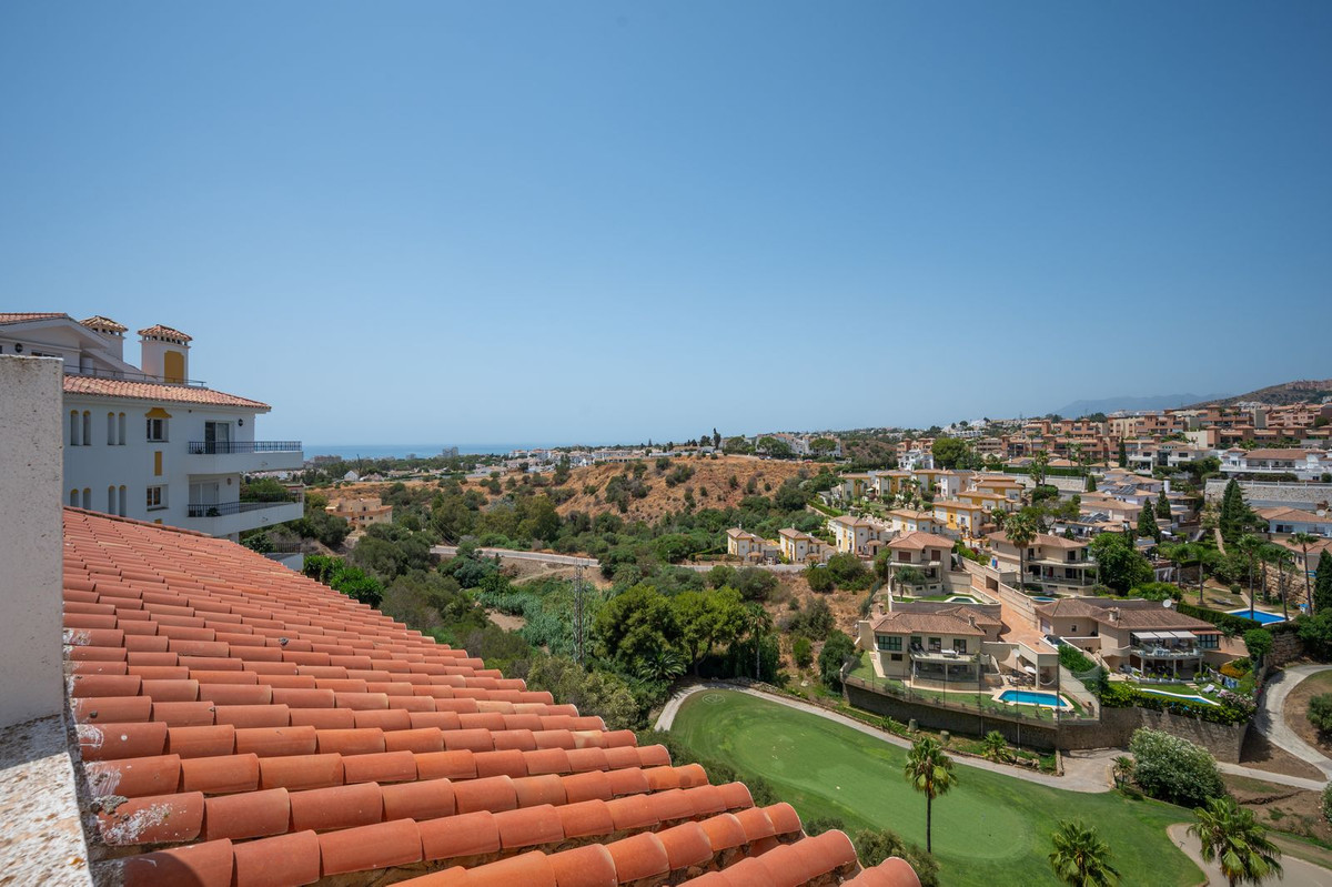 Fantastic sea and golf views from this corner, bright, duplex Penthouse! Located in the popular and pretty Andalucian style Pueblo Olivos complex which has two communal swimming pools and is located within an easy 15 minute walk to the beach, shops and restaurants at the entrance to Riviera Del Sol. This fantastic Penthouse is located on the third floor with no lift. On entering the property you will immediately find it bright and welcoming, on this floor you have a good size living/dining room, a fully fitted, open plan kitchen, two good sized double bedrooms and two bathrooms, one which is en suite to the master bedroom. Also on this floor there are two separate terraces facing both east and west, the east facing one has super sea views and is accessed through patio doors from the master bedroom and the second west facing terrace is accessed from the living room and has wonderful front line golf views, sea views and views down the coast to Gibraltar and over to Africa! There are stairs which lead you up to the roof top terrace. Plus at the top of the stairs there is a spacious area with windows which could be used as a third bedroom or an office! There are open communal parking spaces for owners. With access to enjoy the sun all day and all year, wonderful views, excellent location and a spacious penthouse this property must be viewed to appreciate.
