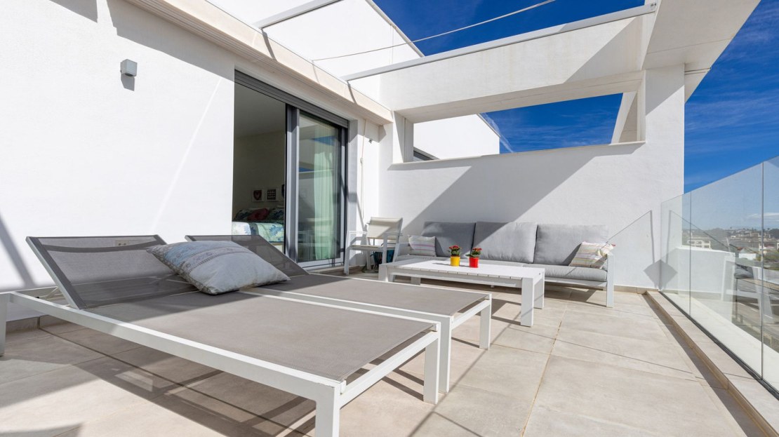 The terrace fits dining table and sun loungers. The retractable sun awnings allow shade in summer and sunny days in winter.