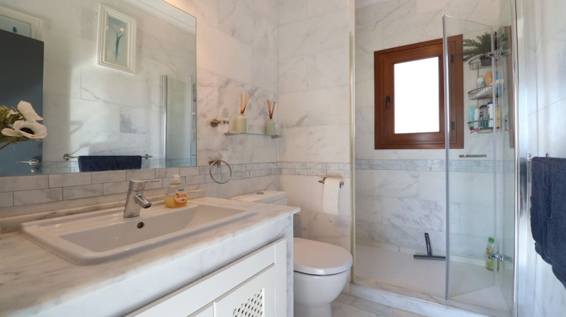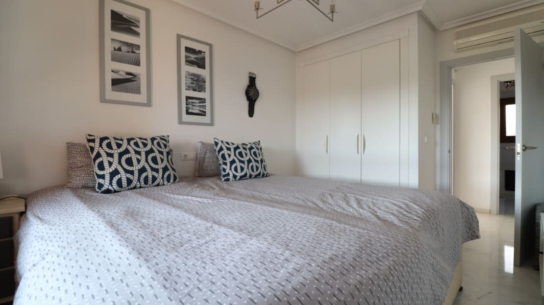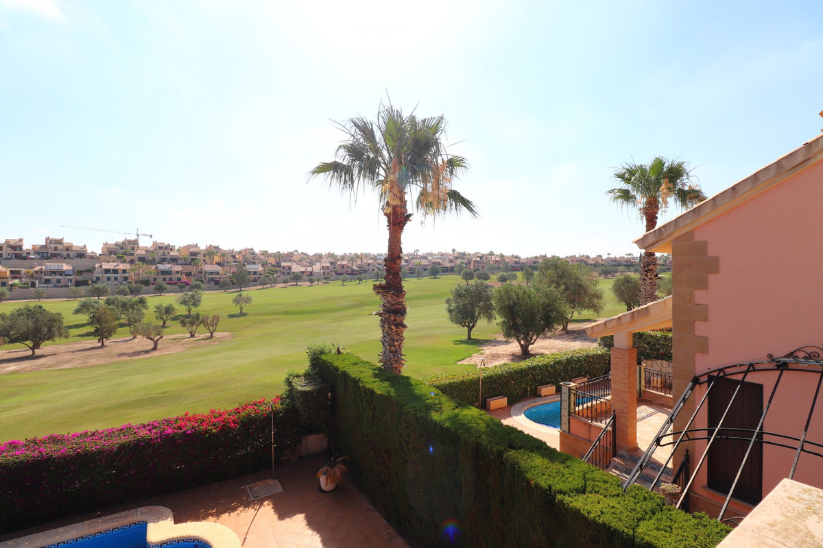 This East Facing, Front Line Golf, Three Bedroom, Link Detached Villa in La Finca Golf Resort is located in Algorfa, Costa Blanca South. This beautifully designed villa offers a perfect blend of luxury and practicality, making it an ideal home for families or those seeking a relaxing retreat. Featuring three spacious bedrooms, one shower room, and one bathroom, this villa provides ample space for comfort and privacy. The property is equipped with an alarm system for added security and air conditioning throughout, ensuring a comfortable living environment all year round. Fitted wardrobes in the bedrooms offer plenty of storage space, and an adjoining utility room adds to the home's convenience. The open-plan living area includes a gas fireplace, creating a warm and inviting atmosphere. The American-style kitchen, complete with natural gas, is both modern and functional, perfect for culinary enthusiasts. A solarium offers a serene space to enjoy the sunny climate and stunning views. The villa boasts a beautifully tiled garden and two terraces, perfect for outdoor dining and entertaining. A private pool provides a refreshing escape, while the property’s front line golf position offers breathtaking golf course views. Situated within a secure gated community with parking, this villa also includes storage under the house, enhancing its practicality. The location is incredibly convenient, with restaurants, bars, and a bakery just a 15-minute walk or a two-minute drive away, and a supermarket reachable in just five minutes by car. This exceptional property in La Finca Golf Resort offers luxurious living in the beautiful and tranquil setting of Algorfa, Costa Blanca South.