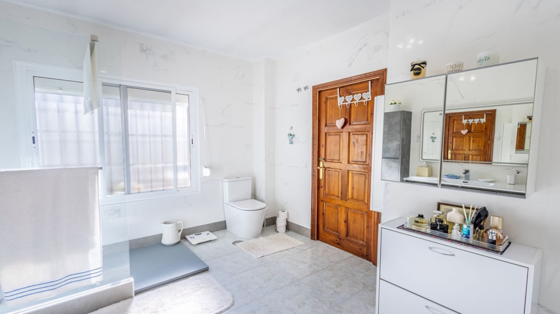 The villa comprises of three bedrooms and two and a half bathrooms. On the first floor there is a large lounge and dining room, an open plan kitchen, a powder room, large hall and entranceway leading to the primary bedroom with supersized bathroom and dressing area. Stairs leading to two guest bedrooms located on the upper floor, both of a generous size plus a large family bathroom. Additionally, there is a balcony terrace with space for sunbathing or alfresco dining.