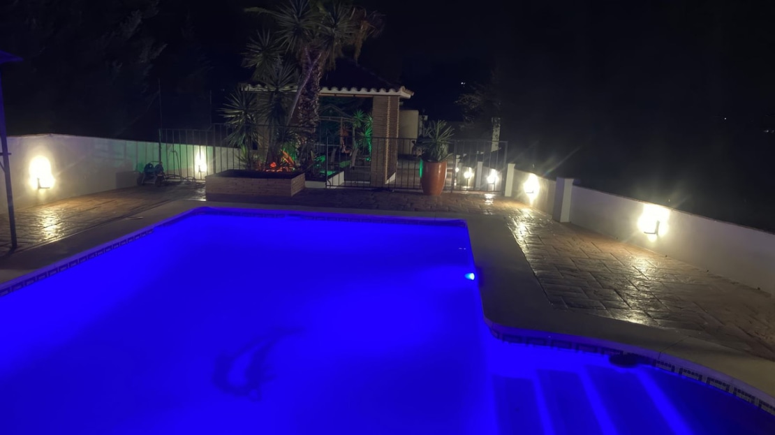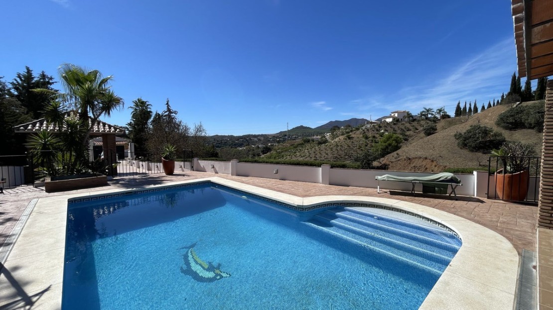 From the living room you have patio doors to a covered terrace, giving access to the pool area, which is surrounded by tiled terracing, as well as offering views to the valley and mountains.