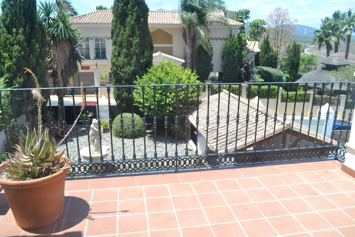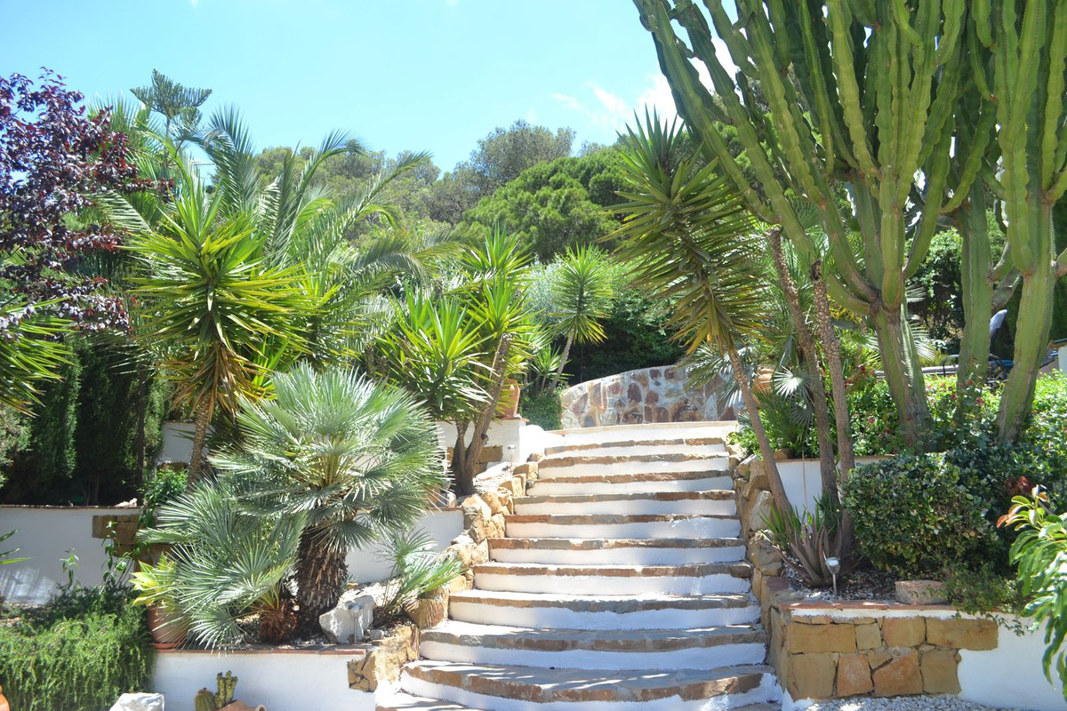 You enter the property via the garage door or pederstrian gate, you have a covered parking space aswell as roadside parking. You go up some stairs to the main level where the property and terraces are located. You have a large front terrace that is easy maintenance with a covered terrace with nice seating area and a hot tub with nice views. The property is set over two floors, as you enter to the left you have a full bathroom, stairs up to the 2nd level and a storage room. In front of you is the big kitchen, fully equiped with a door that can access the back covered terrace and garden area. From the hallway to the right you have a large living / dining room with fireplace and air conditioning. Upstairs straight in front of you, you have the master bedroom with air conditioning, fitted wardrobes, terrace and ensuite bathroom and to the left you have the other 2 bedrooms with fitted wardobes and a bathroom to share.