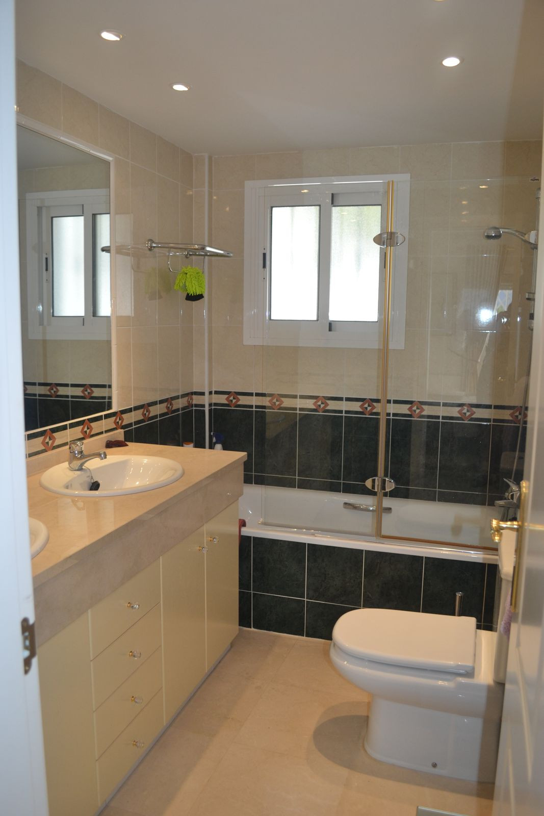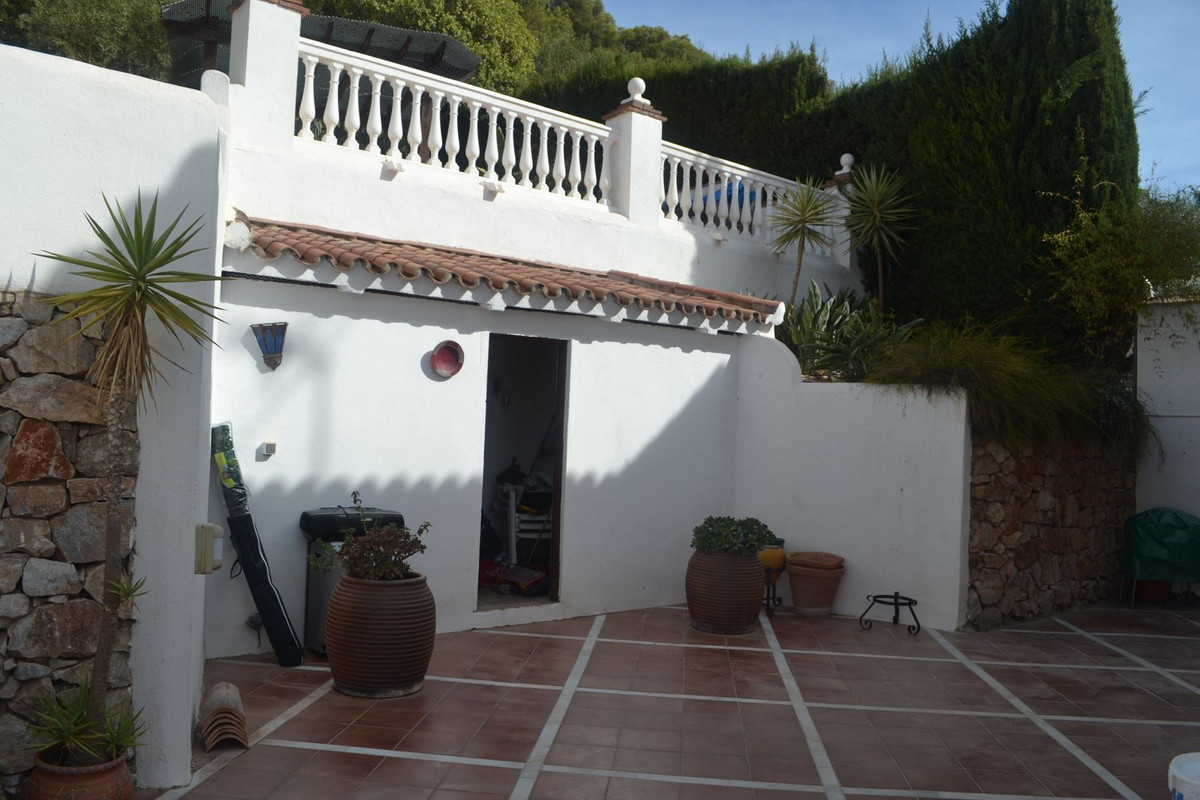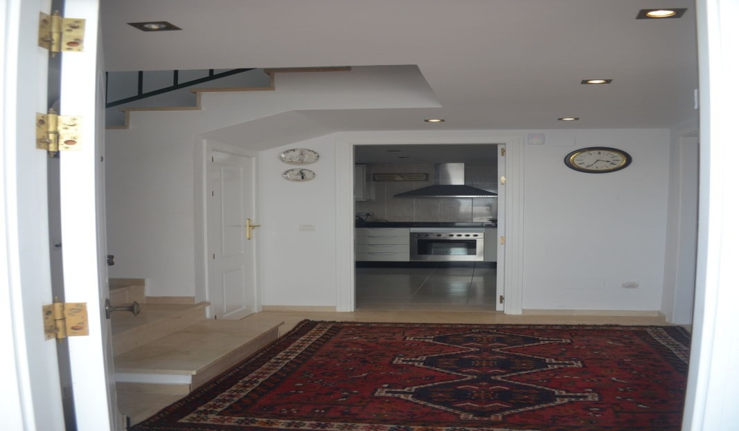 You enter the property via the front garden, where you have your own parking space. You go up a few stairs to the main level where the property and terraces are. You have a large front terrace that is easy maintenance with a covered terrace with nice seating area and amazing views of the golf course and the sunset The property is set over two floors, as you enter to the left you have a full bathroom, stairs to go up to the 2nd level and a small storage room. In front of you is the big fully equiped kitchen with a door that accesses the back terrace and garden area. From the hallway to the right you have the large living / dining room with air conditioning. Upstairs straight in front of you, is the master bedroom with air conditioning, fitted wardrobes, terrace and ensuite bathroom. To the left of the hallway you have the other 2 double bedrooms with fitted wardobes and a bathroom to share.