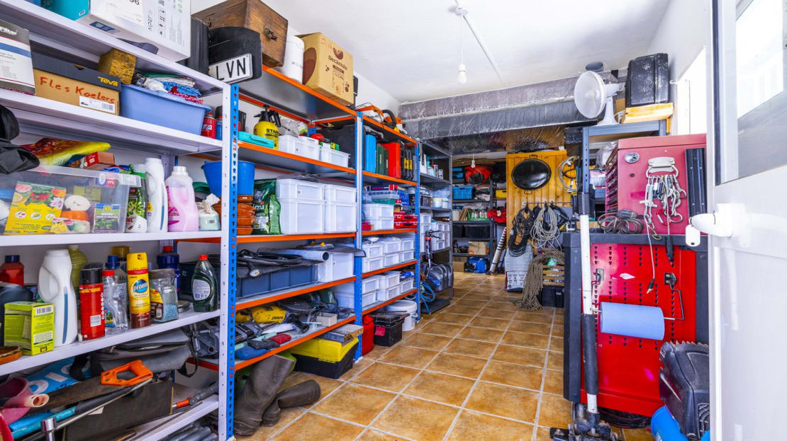 A generous storage room with extra storage space and a traditional Finnish sauna