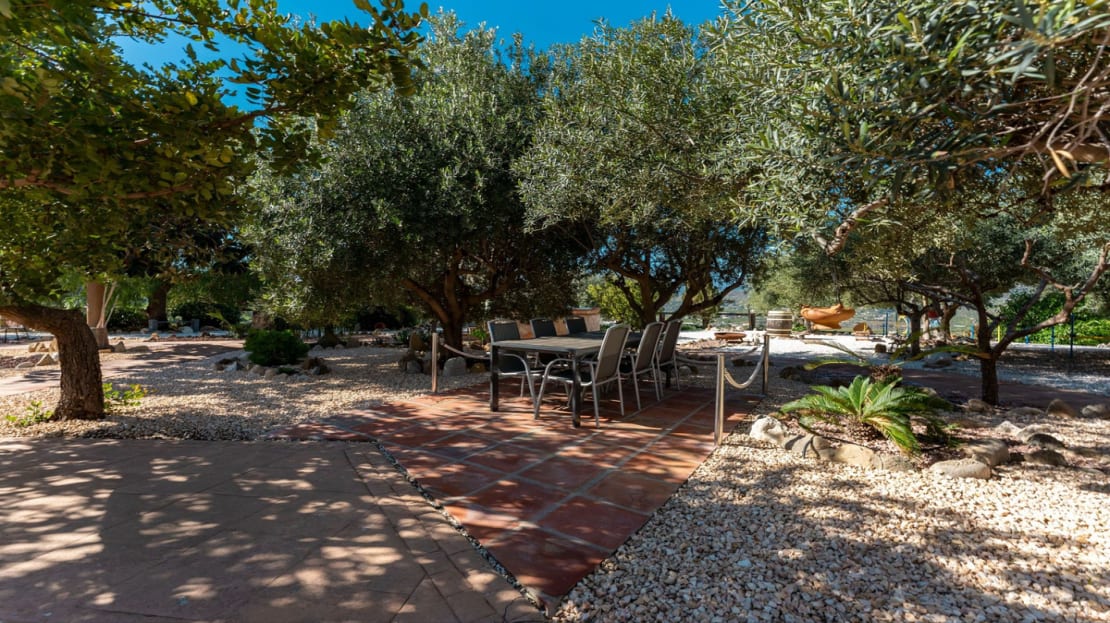 The beautifully landscaped, low-maintenance Mediterranean garden is a true highlight of this property, featuring an *automatic irrigation system and various shaded seating areas under mature olive trees.