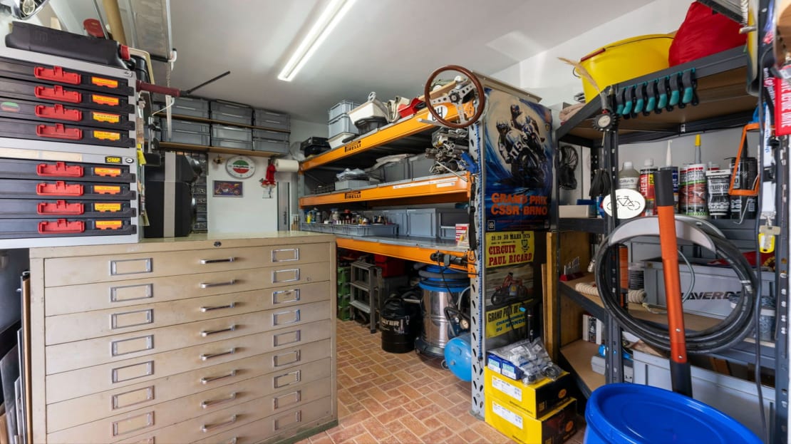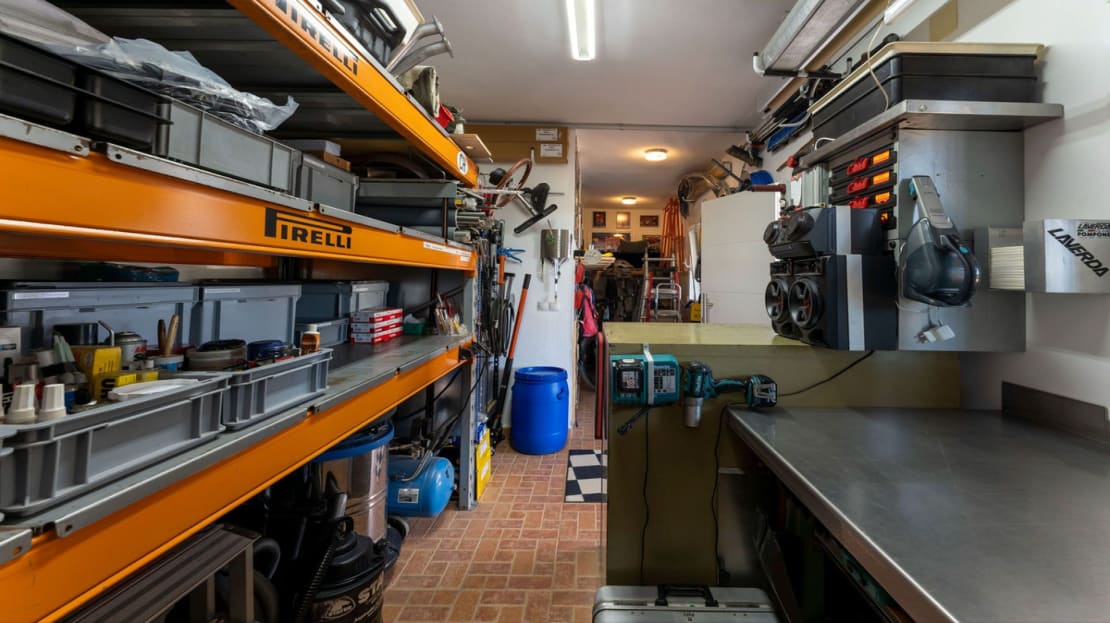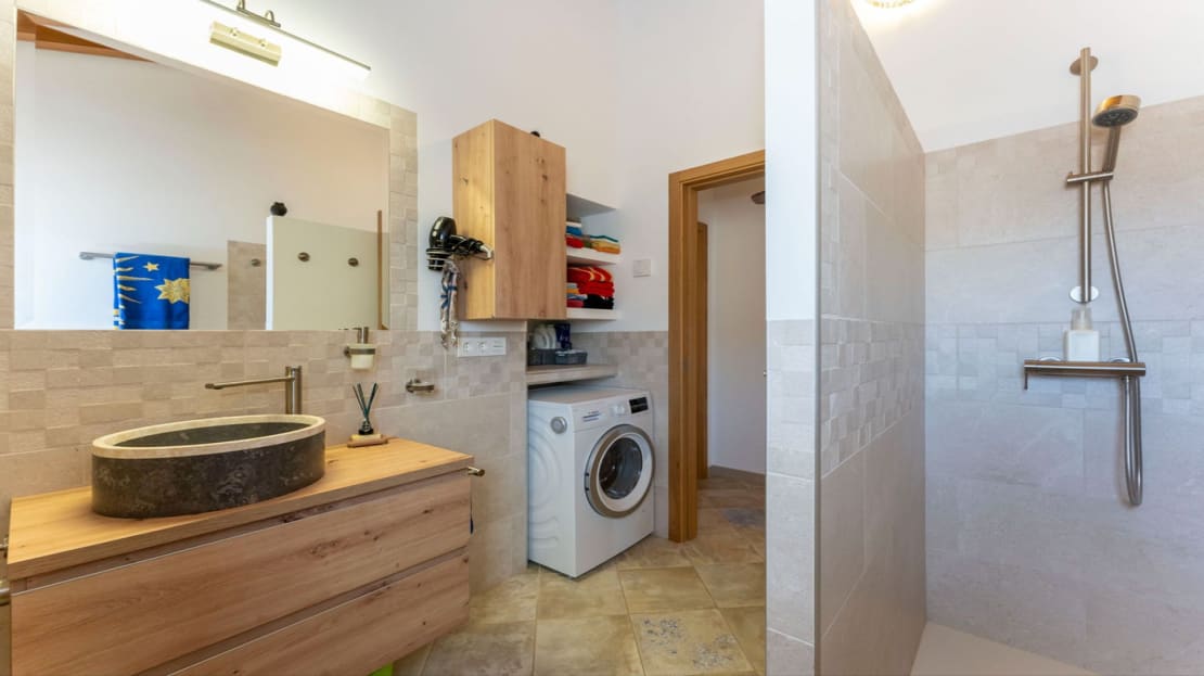 The recently renovated swimming pool is located next to the main house, accompanied by a summer kitchen with a built-in barbecue, guest toilet, and an outdoor shower, ideal for poolside relaxation. Additional features include a storage room next to the summer kitchen.