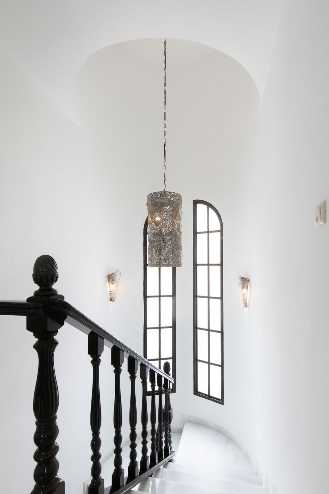 Ascending the beautiful marble staircase takes you to the upper floor, where three generously sized bedrooms await. These bedrooms feature hardwood window frames with mosquito nets and blackout shutters, along with spacious built-in wardrobes. The bathroom on this floor showcases a captivating design, complete with a large walk-in shower, a luxurious washbasin, and a toilet.