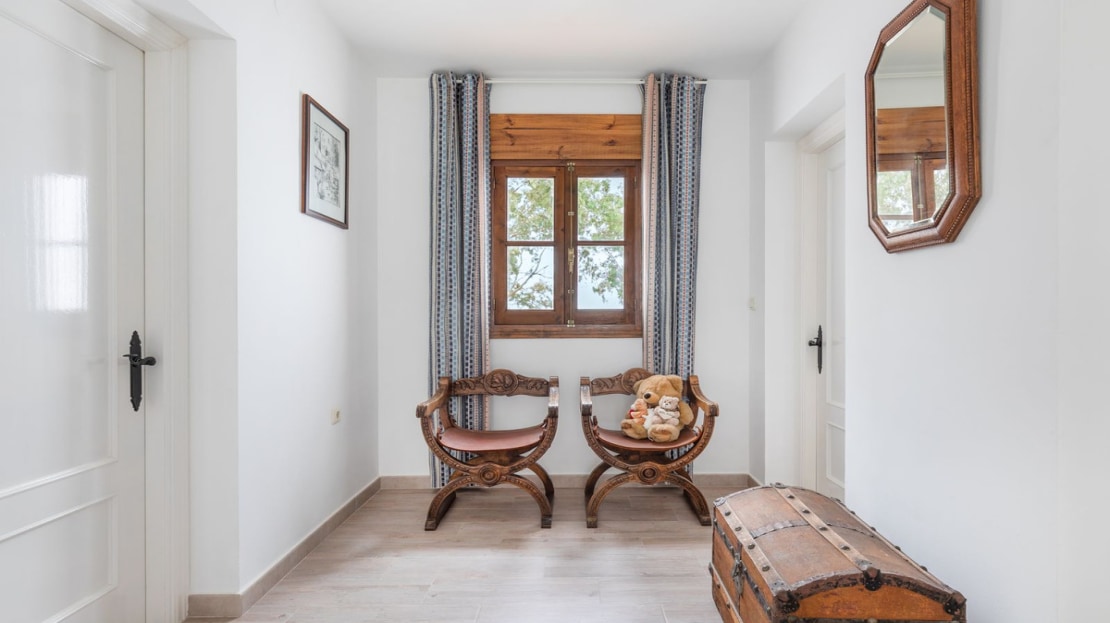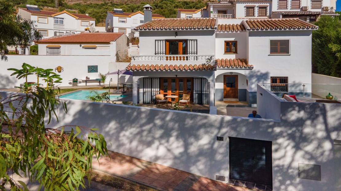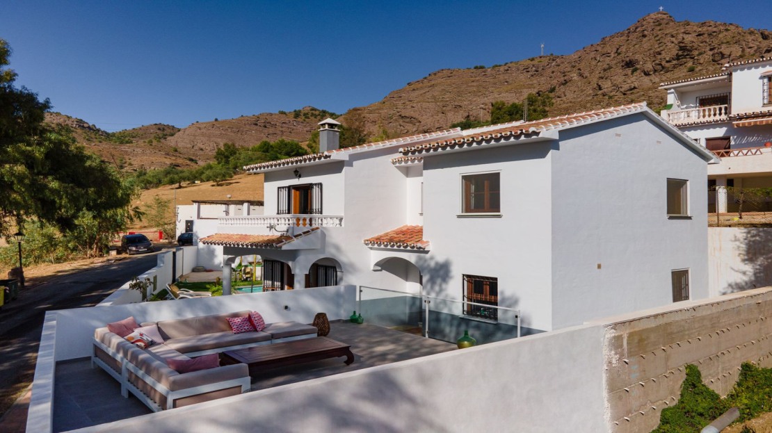 Moving outdoors, the property boasts an inviting plot with a newly installed gate, equipped with video function and remote control. As you enter, you'll be greeted by a tastefully designed terrace surrounding the L-shaped pool. The garden offers abundant space, adorned with beautiful landscaping and an irrigation system, ensuring privacy and tranquility. The garage provides access to a roof terrace that offers breathtaking views of the valley, a perfect spot to relish warm Andalusian evenings.
