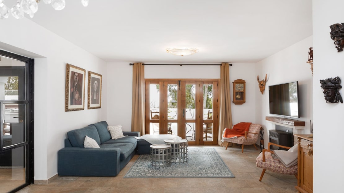 Upon arrival at the house, you are greeted by a splendid entrance door that leads you into the hallway, providing access to the living room, staircase, a bathroom, and a fully equipped open kitchen with a bar. The entrance to the living room is accentuated by stunning industrial glass doors. The living room itself boasts ample space, garden doors that open up to the garden, and a pellet stove, perfect for the winter months.