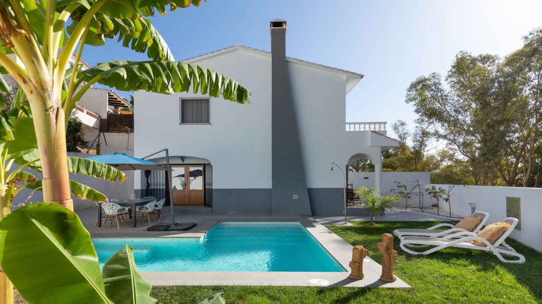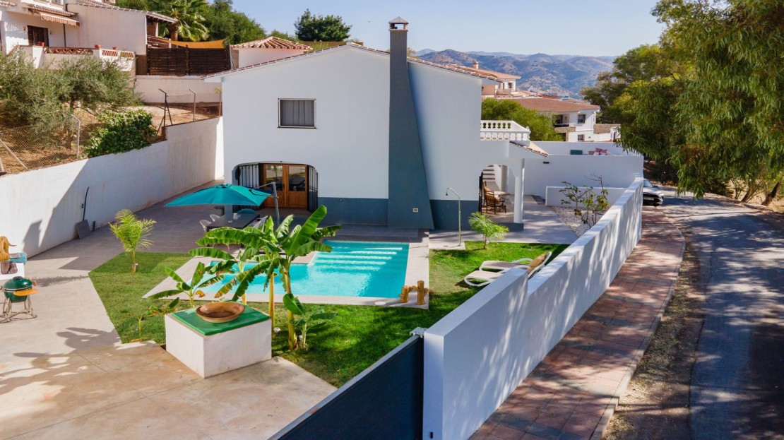 Presenting a stunning high-quality villa with a pool, nestled in the sought-after area on the outskirts of Álora pueblo. This is a remarkable opportunity to own a luxuriously designed town villa, featuring a brand-new L-shaped pool, outside kitchen, a spacious private garage with a roof terrace with toldo, and a meticulously landscaped garden. The entire house has undergone a comprehensive transformation, adhering to modern standards while exuding an appealing contemporary aesthetic.
