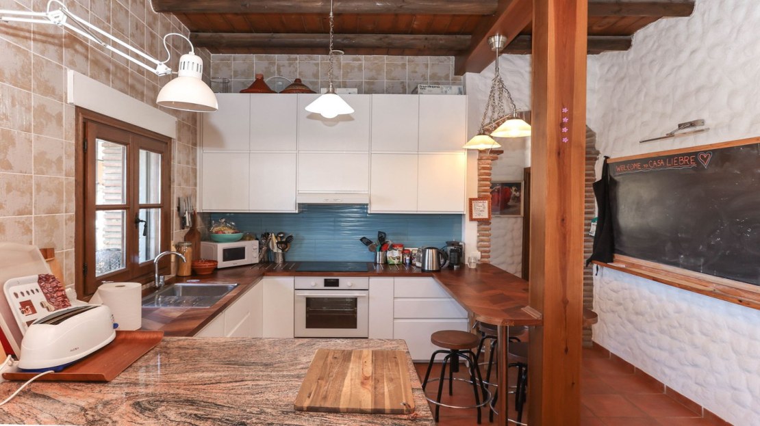The breafast terrace welcomes you to the property and is of course located close to the kitchen. The front door leads you into the property via hallway, there is also access via french windows into the lounge. The cloakroom/shower room is located on the left, to the right is access to the open plan kitchen lounge, this room is extremely welcoming with high vaulted ceilings and french doors leading to the left front and right side of the property where you will find a lovely shaded terrace that includes the bbq area/outdoor kitchen. A wood burning stove is located at the far end of the lounge to provide winter heat.
