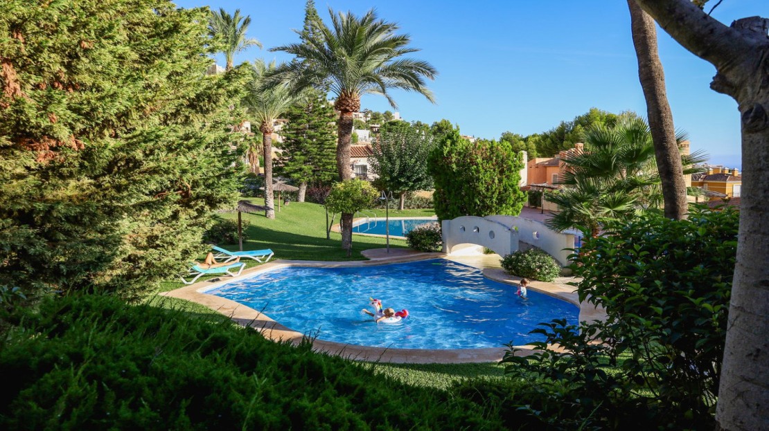 The communal area contains: pool, green areas and play side : ping-pong table