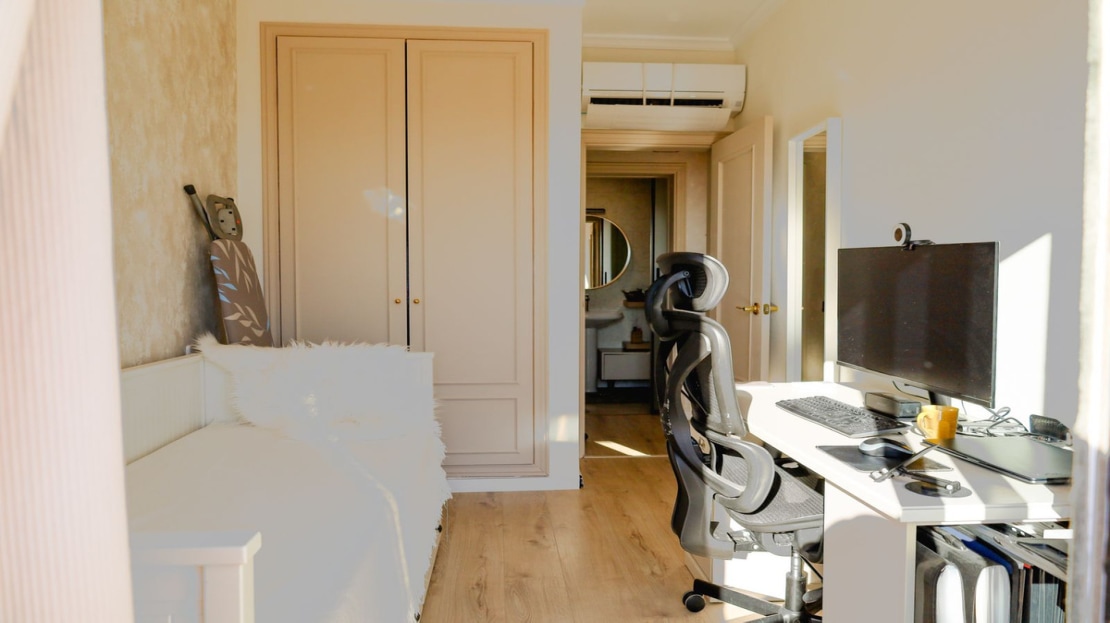 The master suite includes a large bathroom, fitted wardrobe and a private sunny terrace.