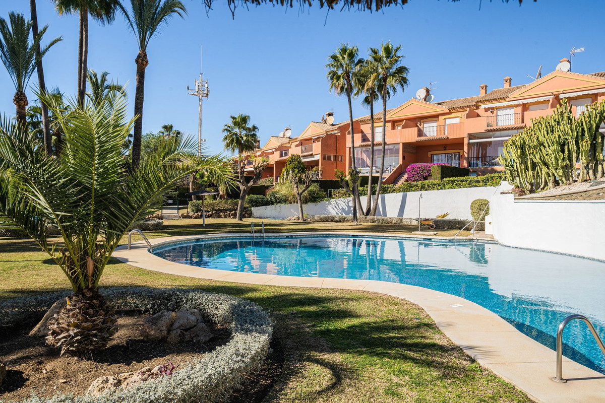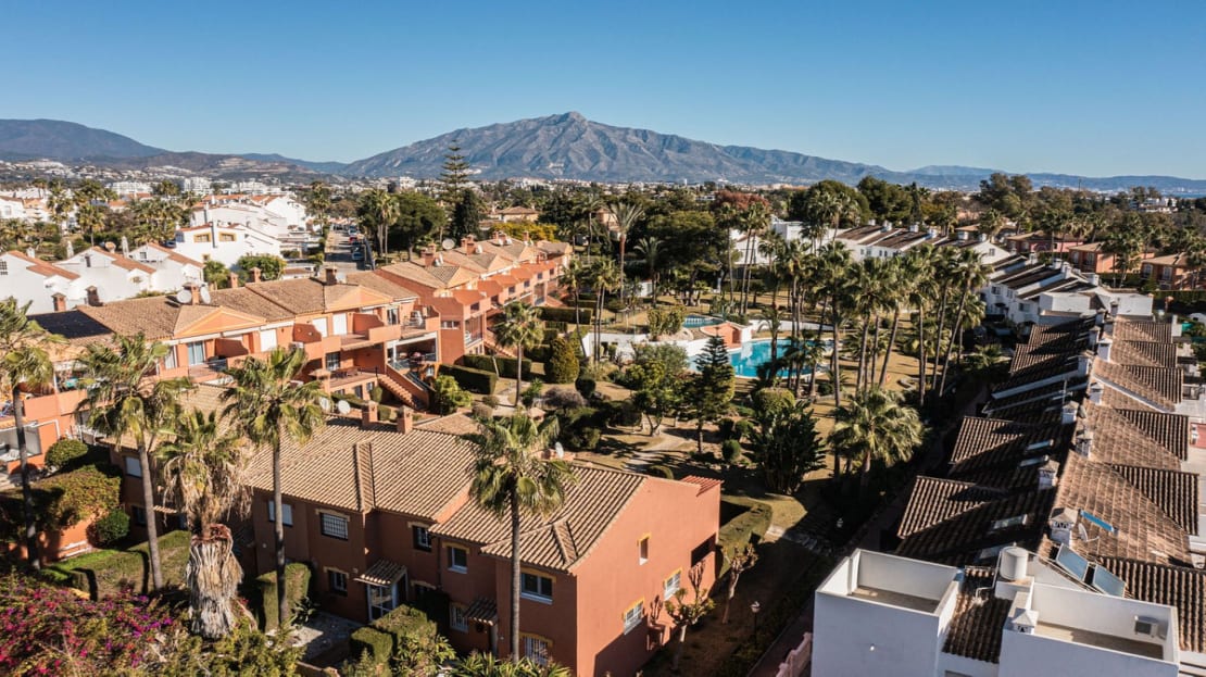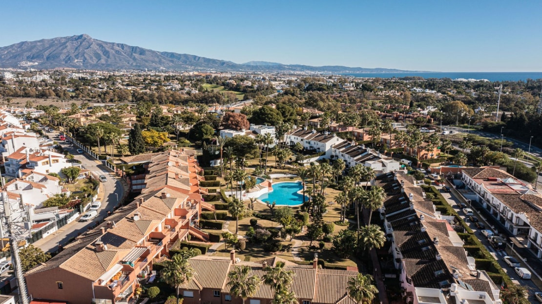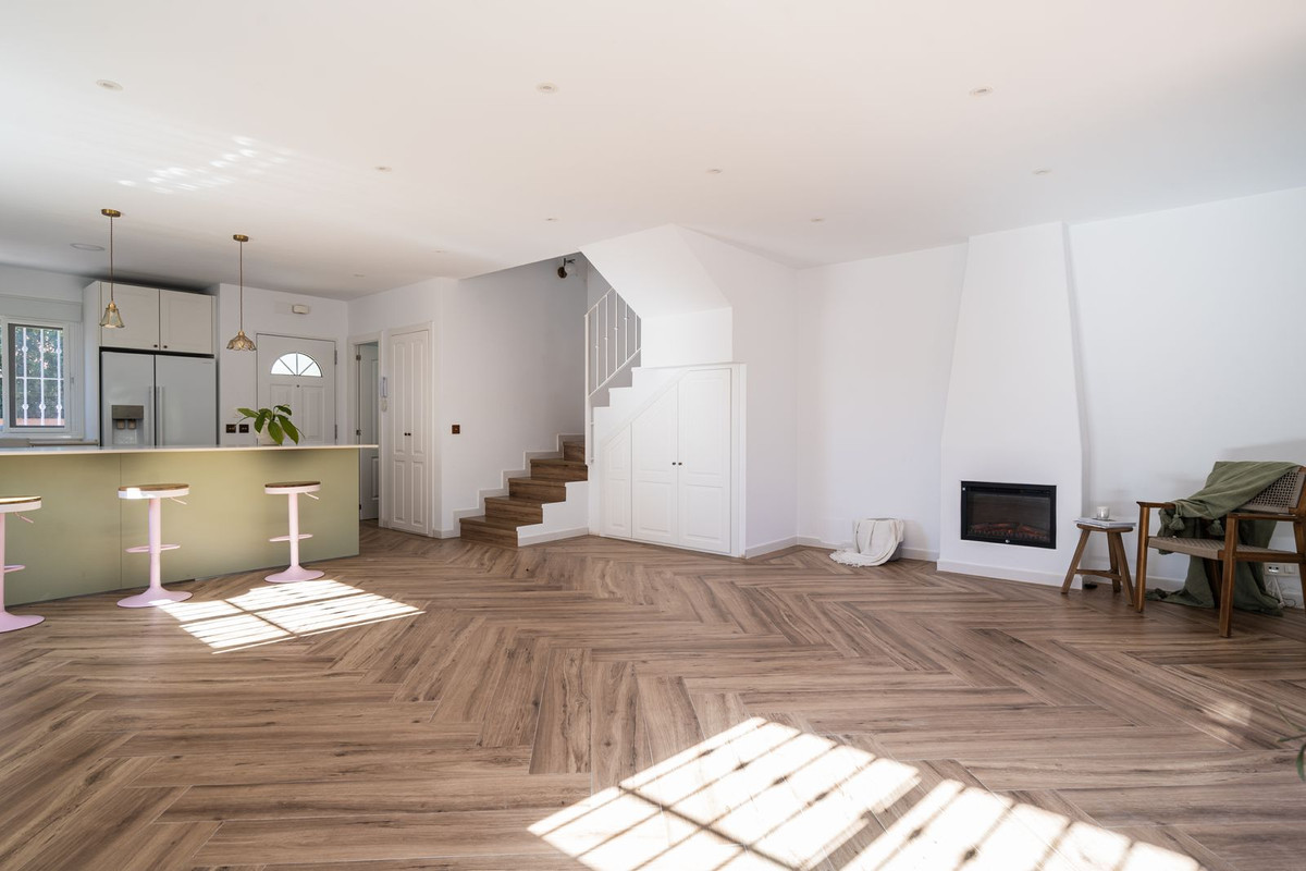 The townhouse is distributed over 2 floors, on the entrance level you are welcomed by an open plan kitchen and living room leading out to the terrace and garden. The outdoors are very private with both covered terrace and grass, and from here you can access to the community garden and pool area.