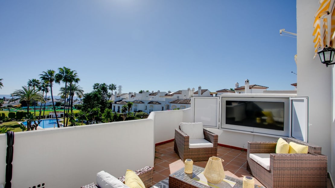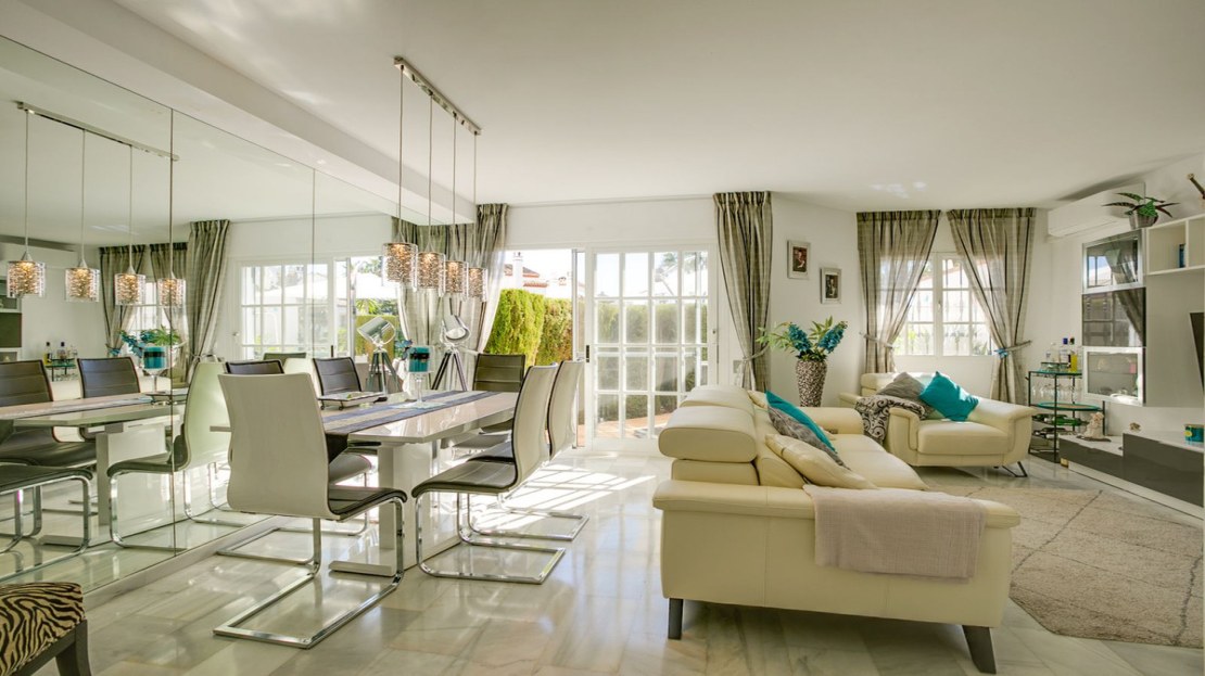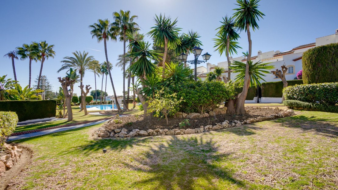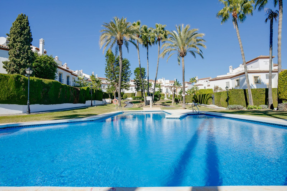 Lovely townhouse with 3 bedrooms and 2 bathrooms and guest toilet. There is a front garden where you enter into the house, a fully fitted kitchen which can be opened up should anyone require and living, dining room which opens onto the private garden and then into the communal garden with large swimming pool.