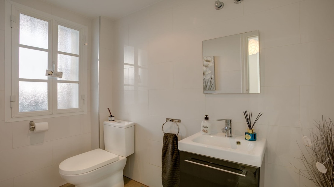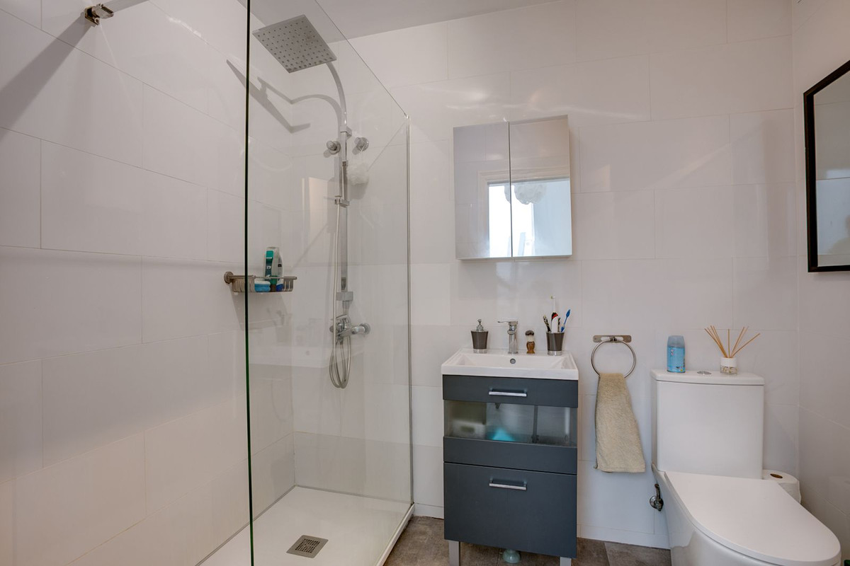 Upstairs are 3 bedrooms 2 bathrooms and roof terrace with lovely sea views. Parking is possible directly outside the house and from the house you can walk to supermarkets, shops and beach. Perfect family home in a great location.