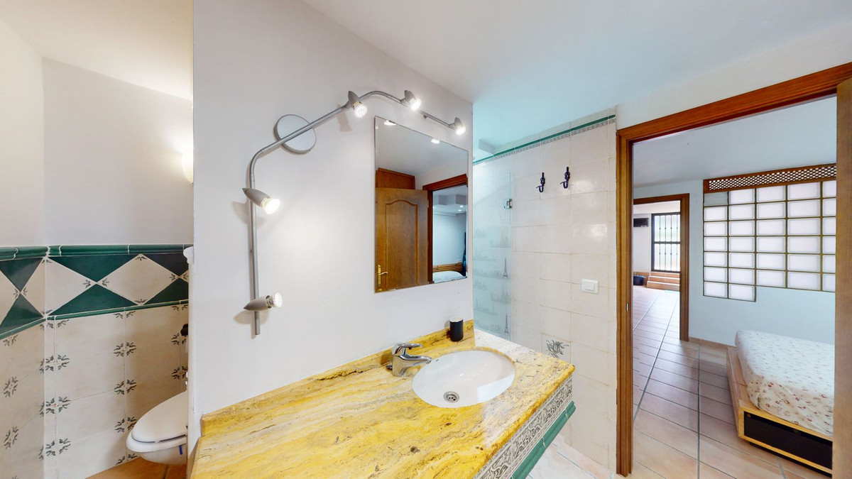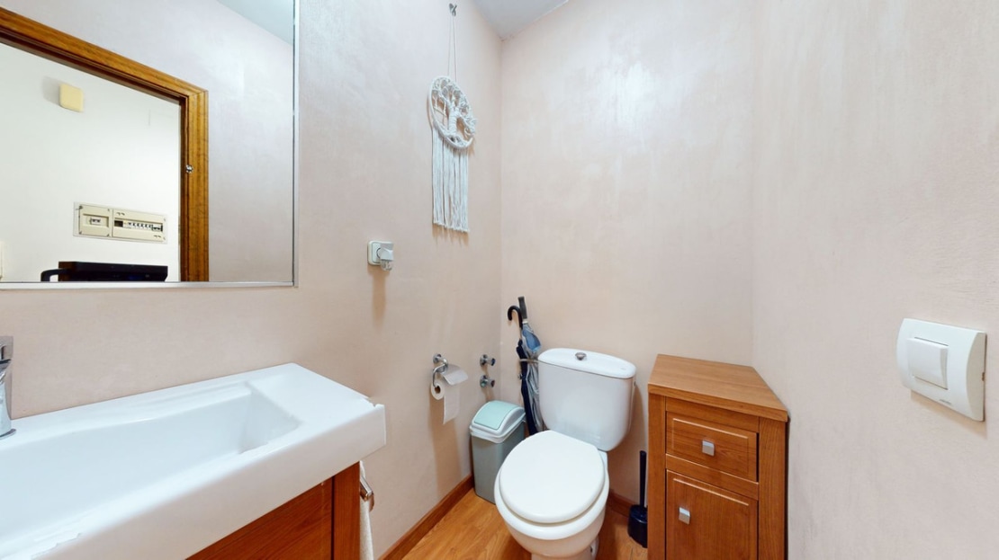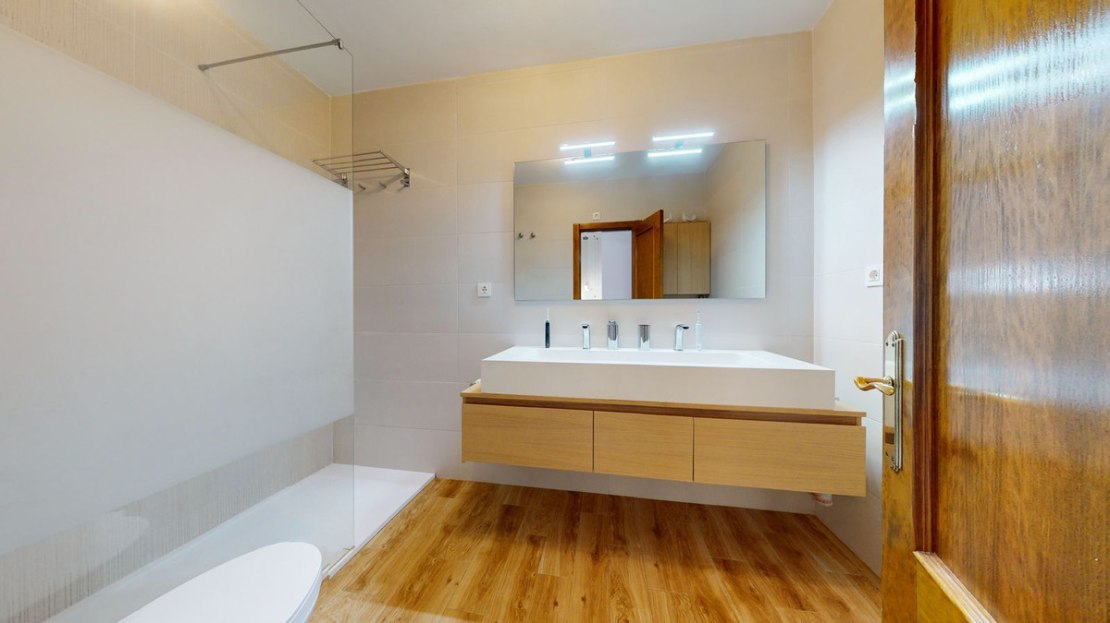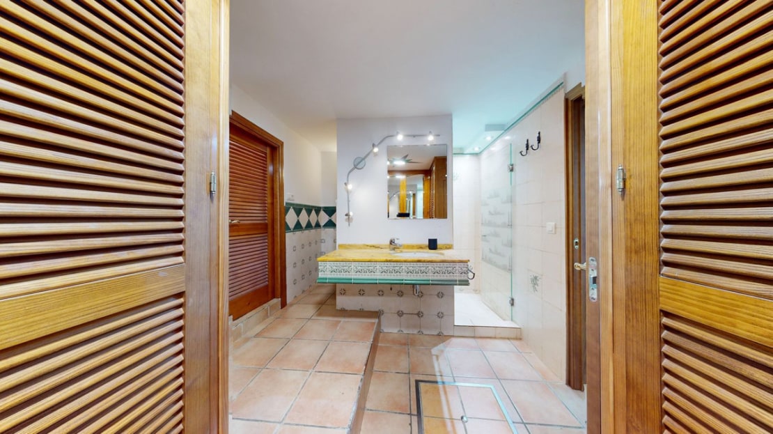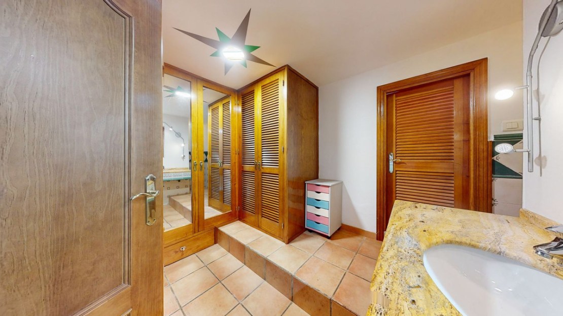 On the first floor, there are two bedrooms, with the main one featuring a walk-in closet and terrace. The secondary bedroom includes a built-in wardrobe. There is also a complete bathroom with double washbasin.<…(Ver más)