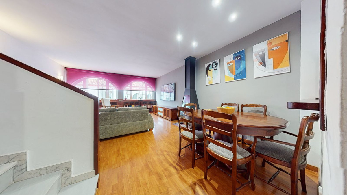 The property is distributed as follows: upon entering, a foyer leads to a guest toilet and a semi-open kitchen integrated with the spacious living-dining room, highlighted by a cozy fireplace.