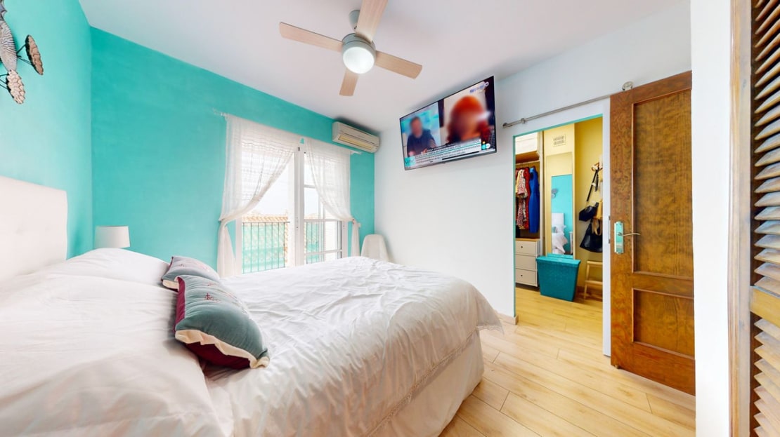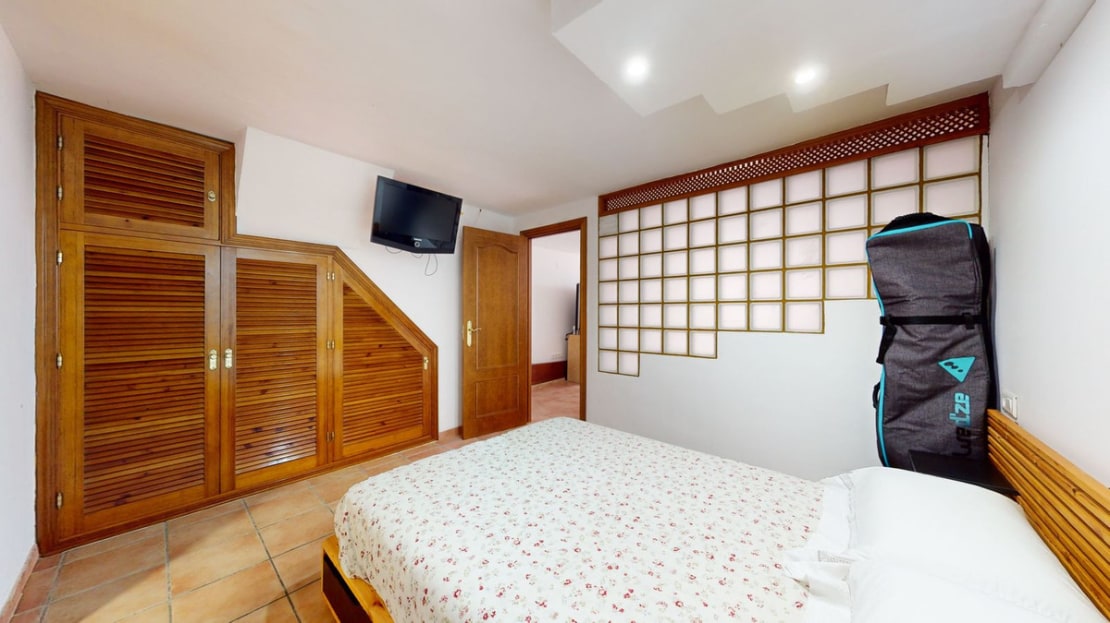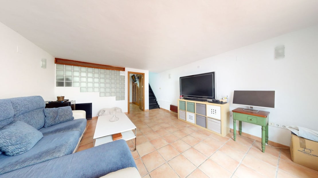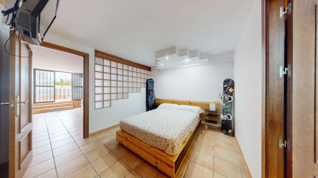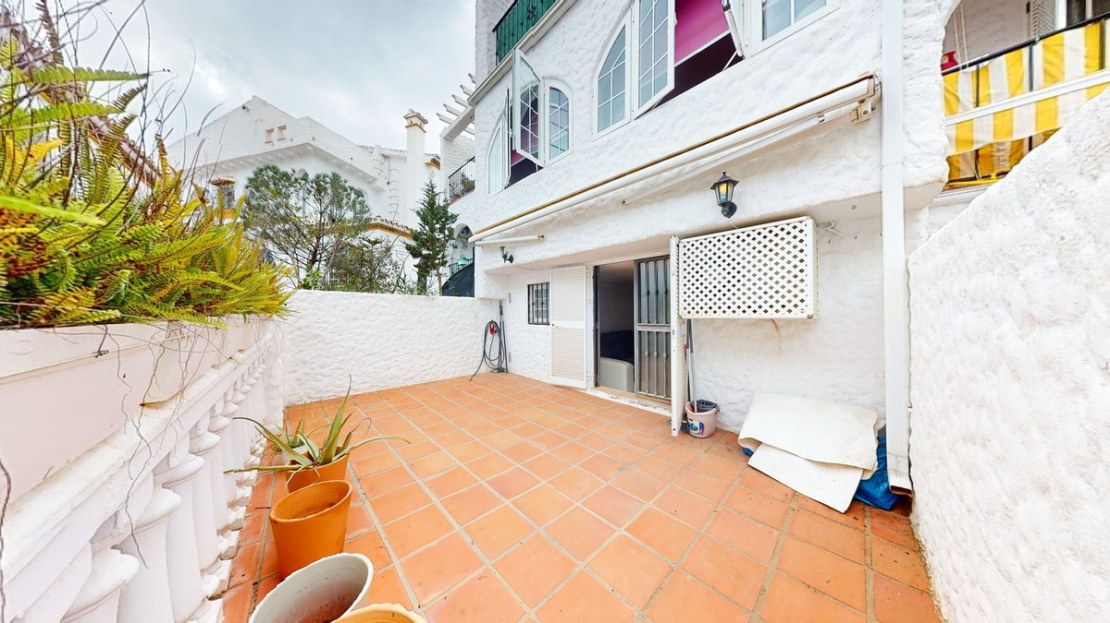 Spectacular exclusive chalet for sale in Benalmádena Torremuelle. This is a three-story townhouse located in the private Tío Charles Residential Area with nighttime security. The complex is in the style of an Andalusian village, featuring picturesque streets and squares, as well as two spacious pools surrounded by lush gardens offering panoramic views of the bay of Malaga and Fuengirola.