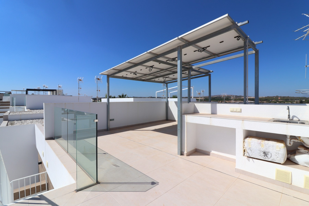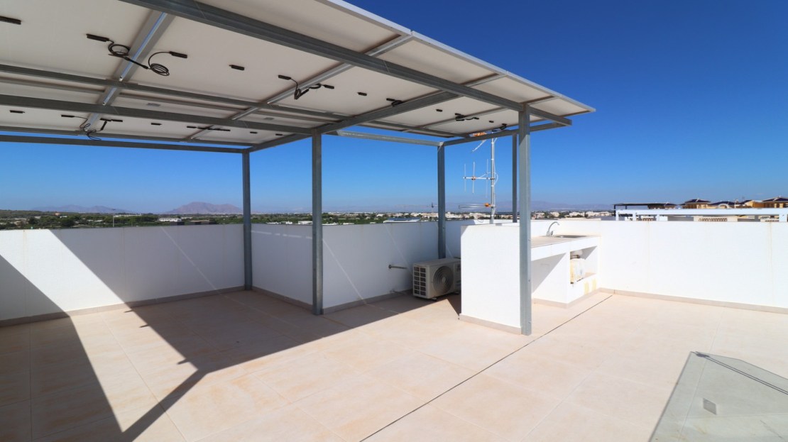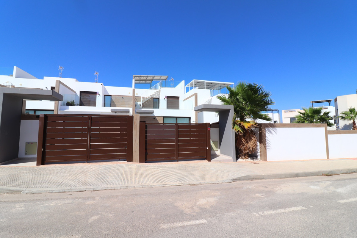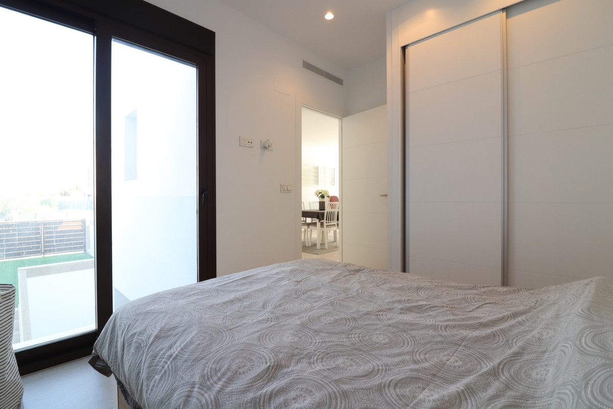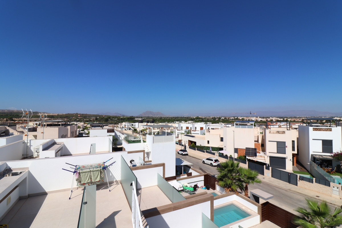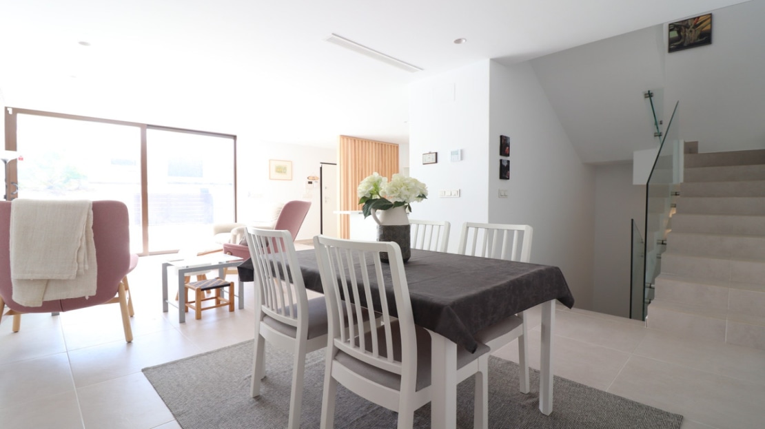 This As New East Facing, Three Bedroom Townhouse in Benijofar is located just a 3-minute walk from a variety of local amenities and facilities, offering convenience and modern living in the heart of Costa Blanca. This stylish property boasts 3 bedrooms, each with direct access to private terraces, 2 contemporary shower rooms, and a cloakroom. The master bedroom includes a luxurious en suite, providing a perfect retreat. The home is designed for comfort, featuring ducted air conditioning throughout, with pre-installation in the underbuild, and an open-plan kitchen ideal for modern living. All bedrooms are equipped with fitted wardrobes, offering ample storage. The property also benefits from solar panels, ensuring energy efficiency. Outside, the tiled garden creates a low-maintenance outdoor space, complete with an outside kitchen and a private pool, perfect for enjoying the Mediterranean climate. There’s also access to a municipal pool for additional leisure options. Off-road parking adds further practicality, making this property a fantastic opportunity to enjoy the best of Costa Blanca living.