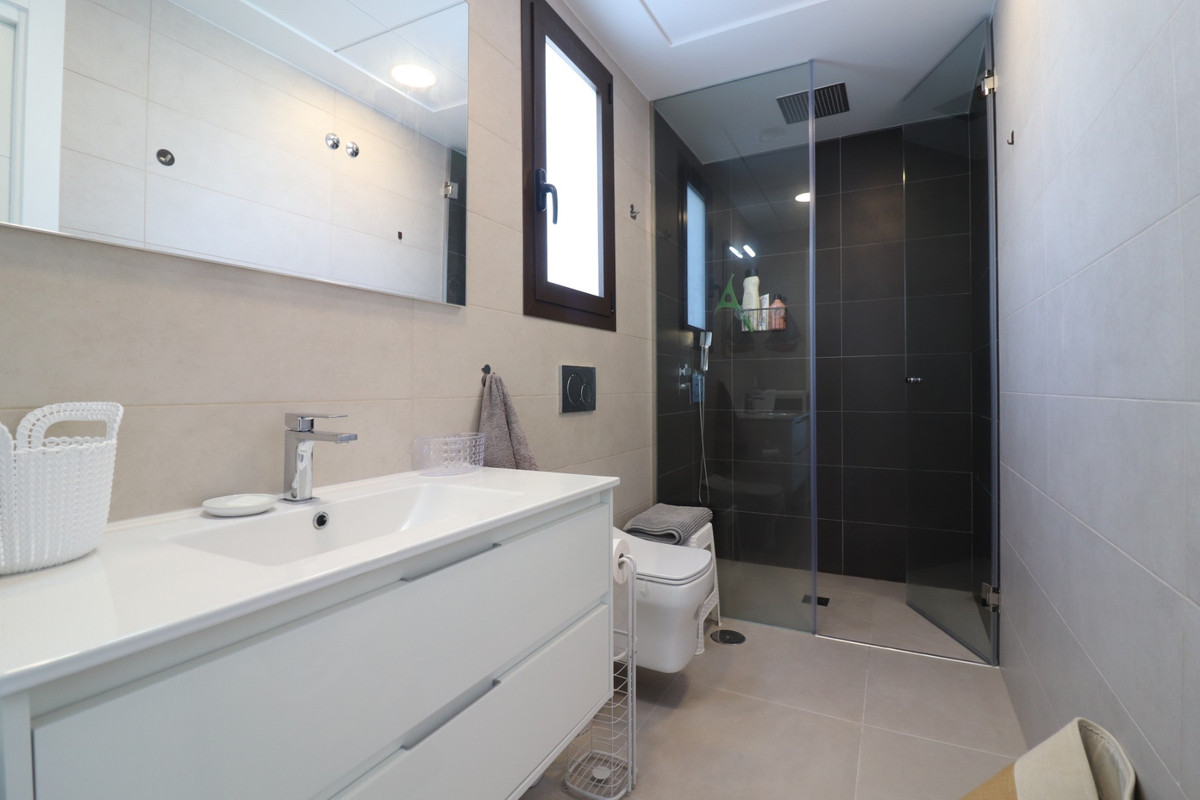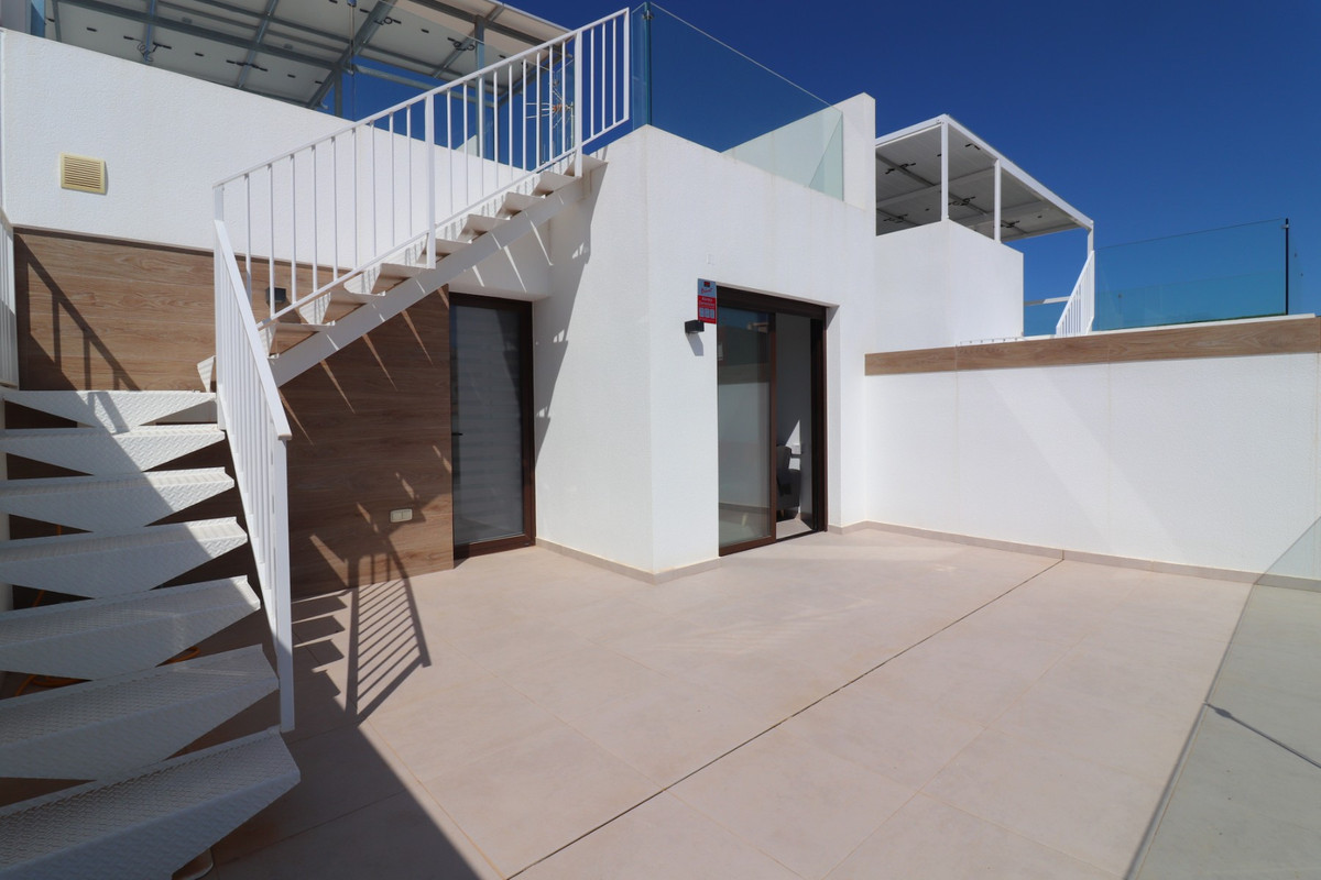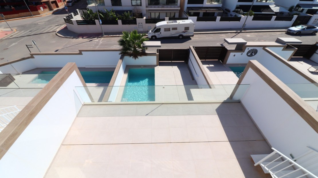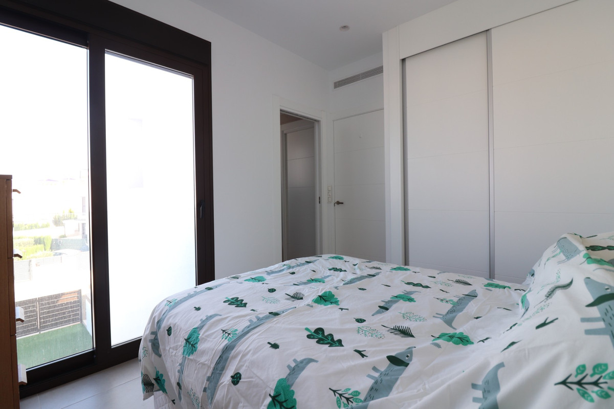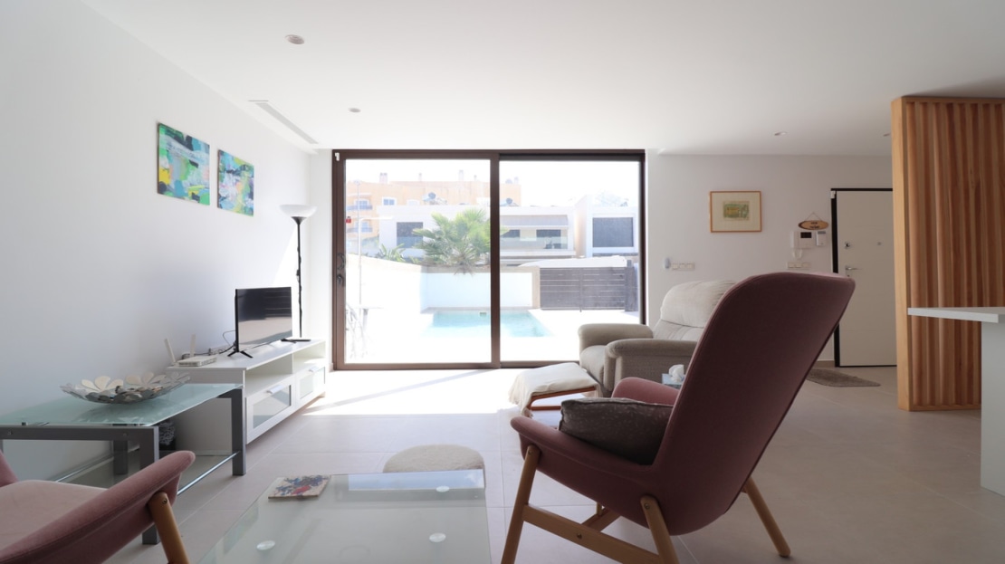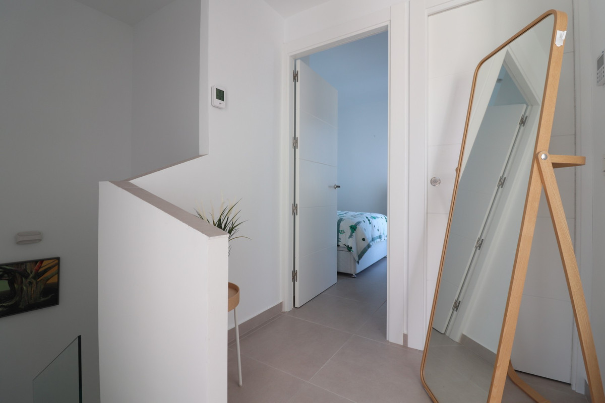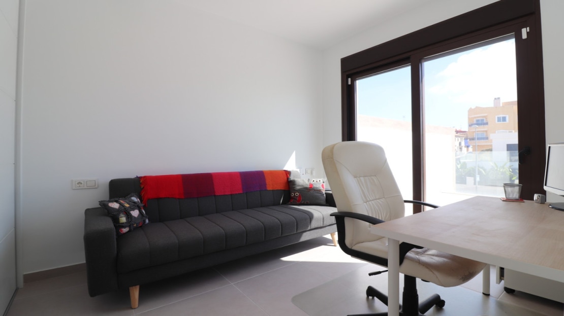 This As New East Facing, Three Bedroom Townhouse in Benijofar is located just a 3-minute walk from a variety of local amenities and facilities, offering convenience and modern living in the heart of Costa Blanca. This stylish property boasts 3 bedrooms, each with direct access to private terraces, 2 contemporary shower rooms, and a cloakroom. The master bedroom includes a luxurious en suite, providing a perfect retreat. The home is designed for comfort, featuring ducted air conditioning throughout, with pre-installation in the underbuild, and an open-plan kitchen ideal for modern living. All bedrooms are equipped with fitted wardrobes, offering ample storage. The property also benefits from solar panels, ensuring energy efficiency. Outside, the tiled garden creates a low-maintenance outdoor space, complete with an outside kitchen and a private pool, perfect for enjoying the Mediterranean climate. There’s also access to a municipal pool for additional leisure options. Off-road parking adds further practicality, making this property a fantastic opportunity to enjoy the best of Costa Blanca living.